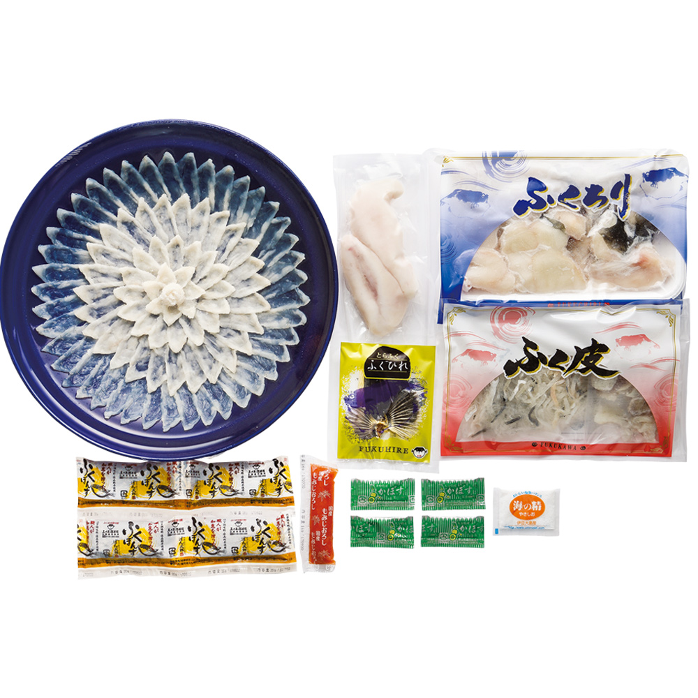 ■内容量:とらふぐ刺身105g(27cm陶器皿)、とらふぐちり身(アラ入り)300g、とらふぐ皮40g、ふぐひれ3枚、ふくポン酢35g×3袋、もみじおろし16g、かぼす果汁2ml×4袋、塩5g、とらふぐ白子110g ※刺身皿のデザインが変更になる場合がございます。