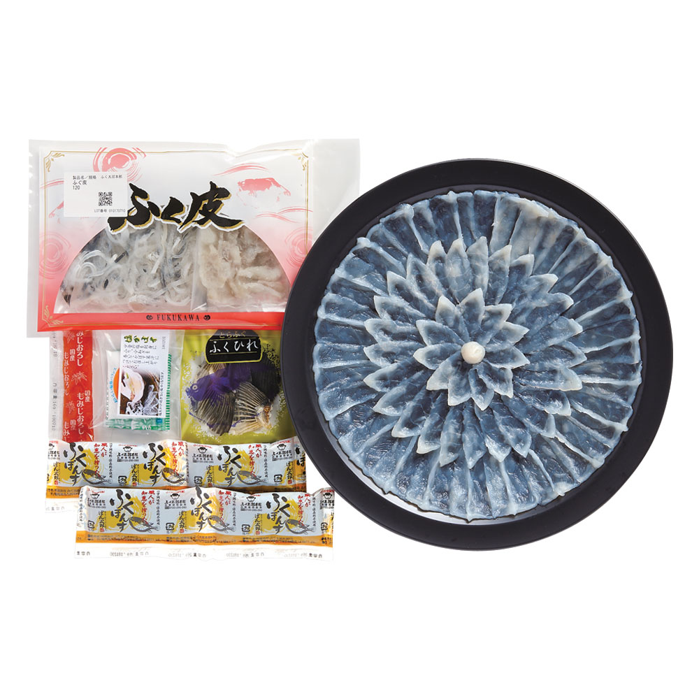 ■内容量:とらふぐ刺身65g(外周古式引き・内周菊盛り、プラスチック皿21cm)、とらふぐ皮40g、ひれ酒用ヒレ3枚、ポン酢35g×2袋、もみじおろし3g×2袋、食塩5g、かぼす果汁2ml×2袋 ※刺身皿のデザインが変更になる場合がございます。