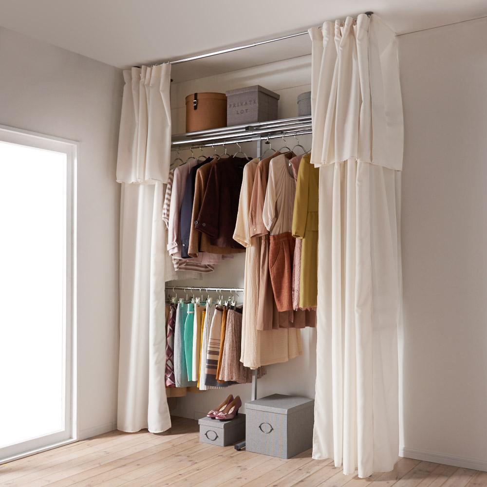 ウォークイン突っ張りハンガー 幅111cm~200cm・ロータイプ(高さ185cm~245cm)・上下カーテン付き