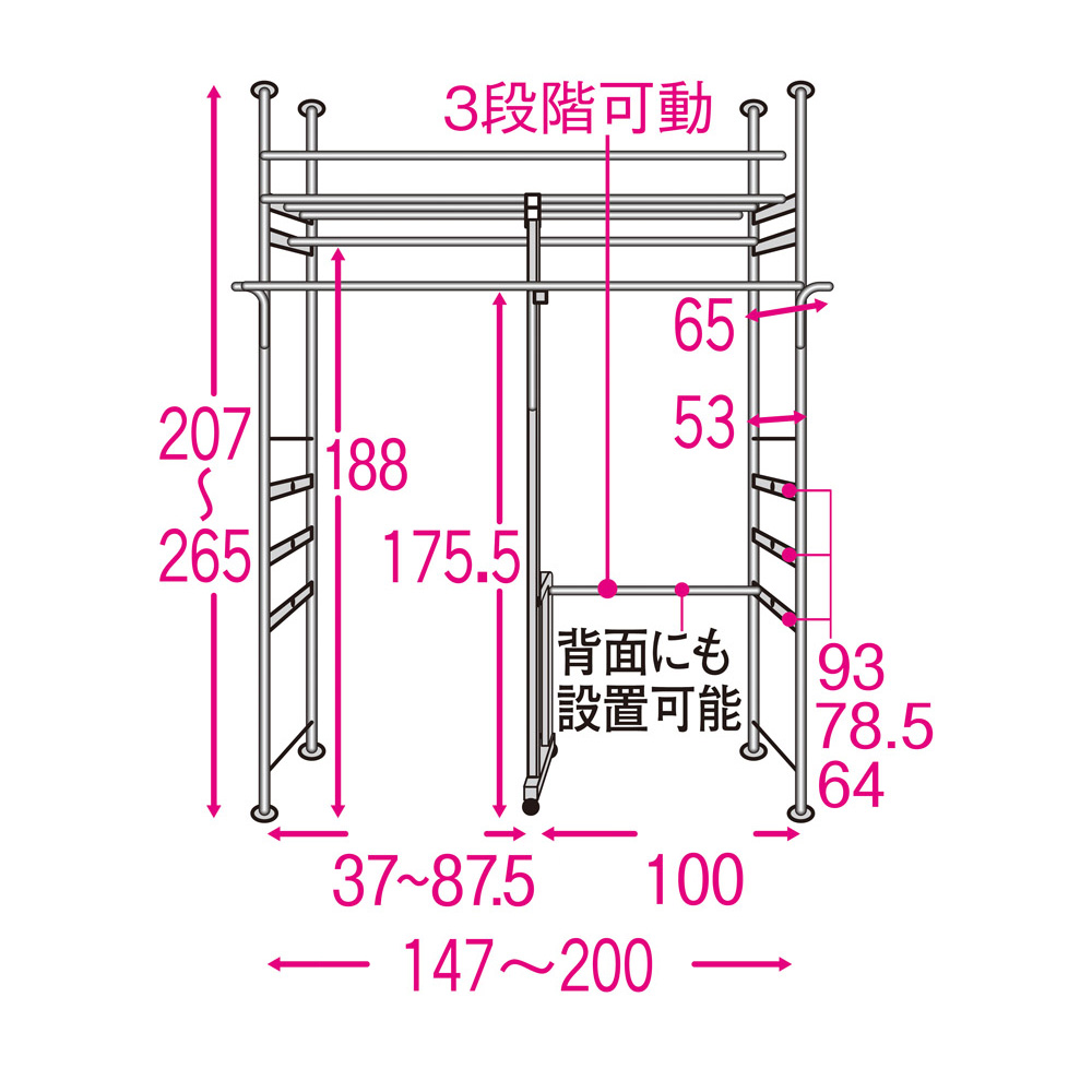 ■サイズ:幅147~200奥行65(サブハンガー取り外し時 奥行53)高さ207~265cm・重さ約26kg