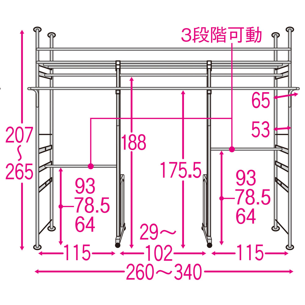 ■サイズ:幅260~340奥行65(サブハンガー取り外し時 奥行53)高さ207~265cm・重さ約37kg