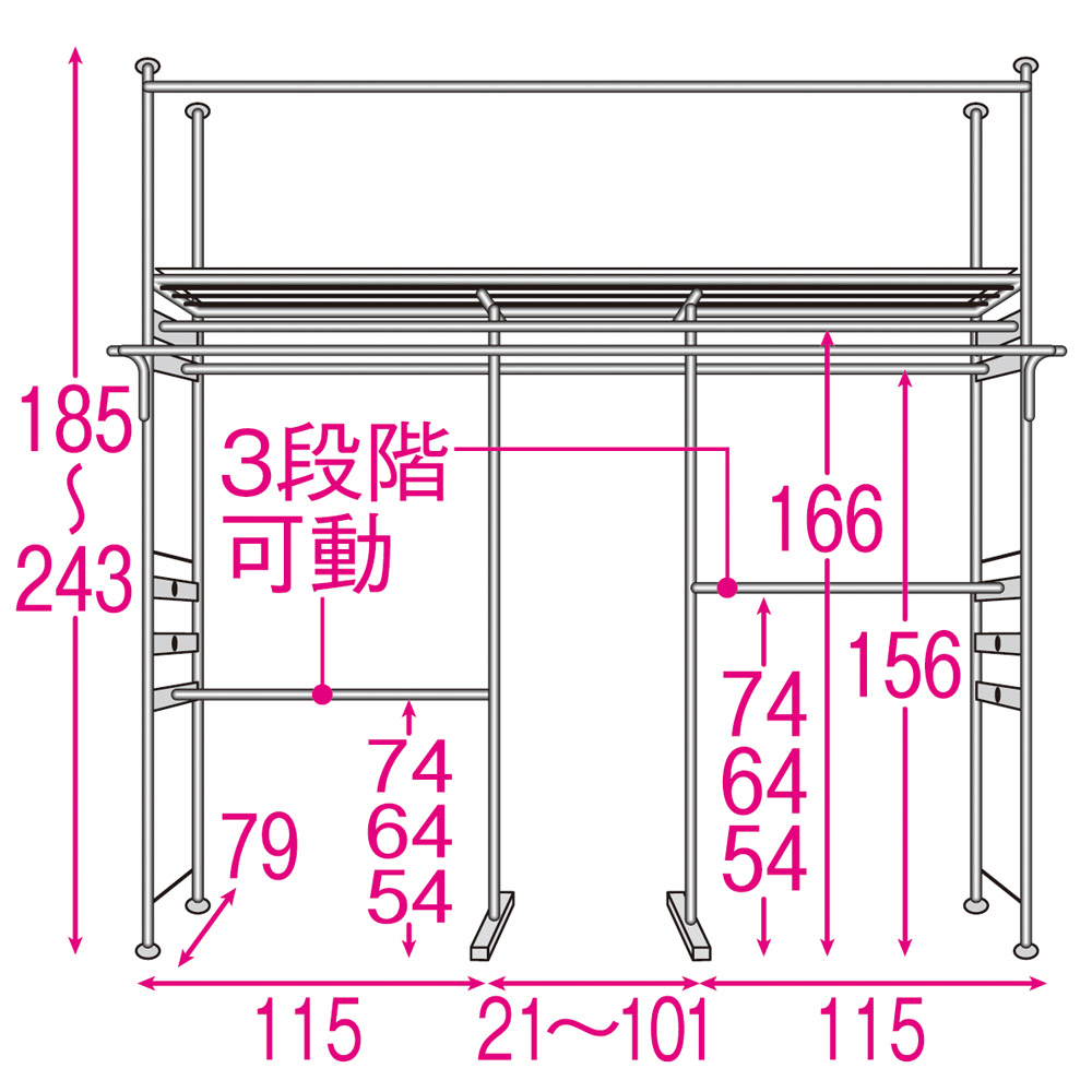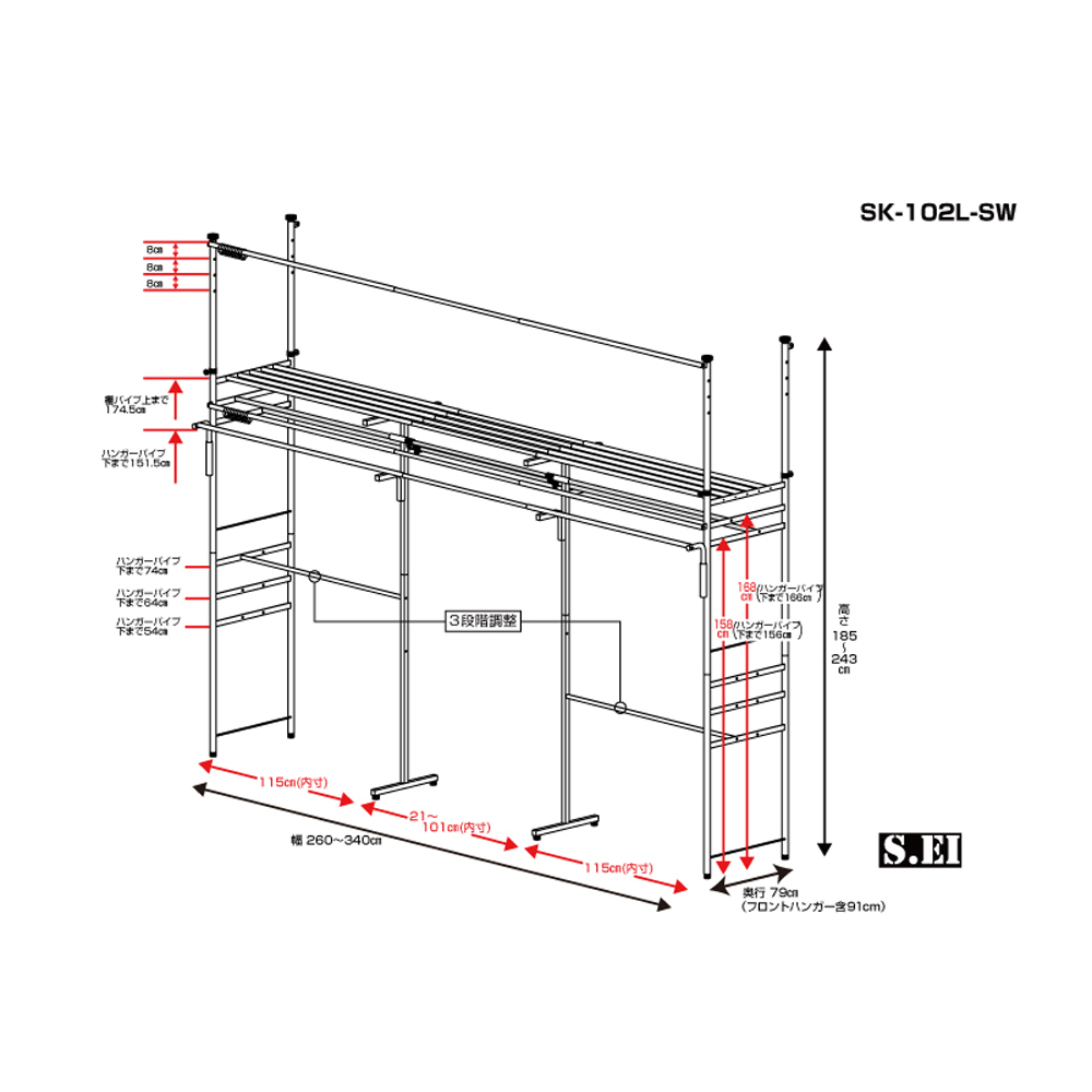 ■サイズ:幅260~340奥行91(サブハンガー取り外し時奥行79)高さ185~243cm・重さ約43kg
