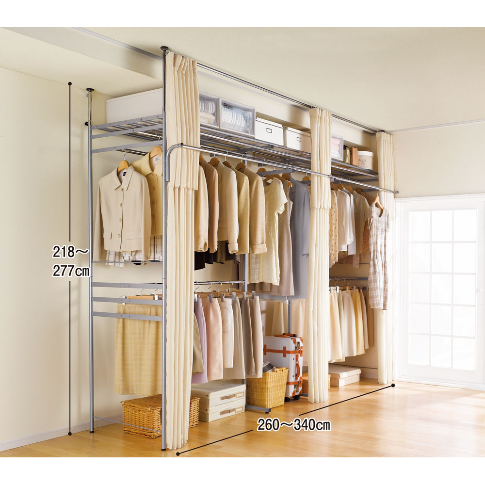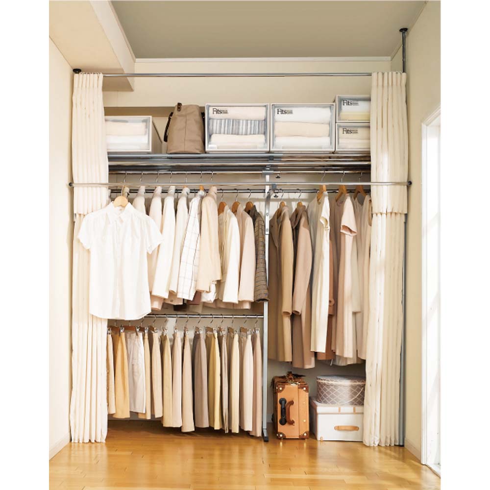 奥行79cm 上下カーテン付き突っ張り頑丈ハンガーラック ハイタイプ・【標準】幅137-230cm対応 クローゼットハンガー カバー 衣類収納 632103