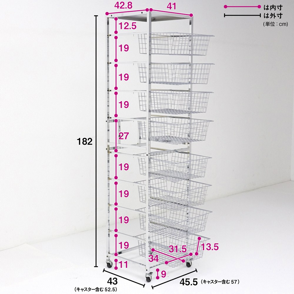 ■サイズ:(キャスター含む)幅57cm、奥行52.5cm、(本体)幅45.5cm、奥行43cm、高さ180cm、重量18kg