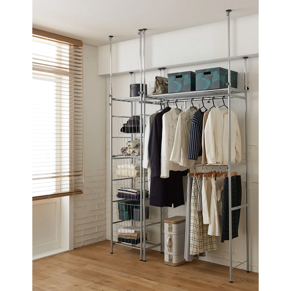 コーディネート例 ロータイプは梁下など低い天井にも対応。ウォークインクローゼット内でも便利に使えます。 ※写真は別売りのバスケットとの組み合わせです。