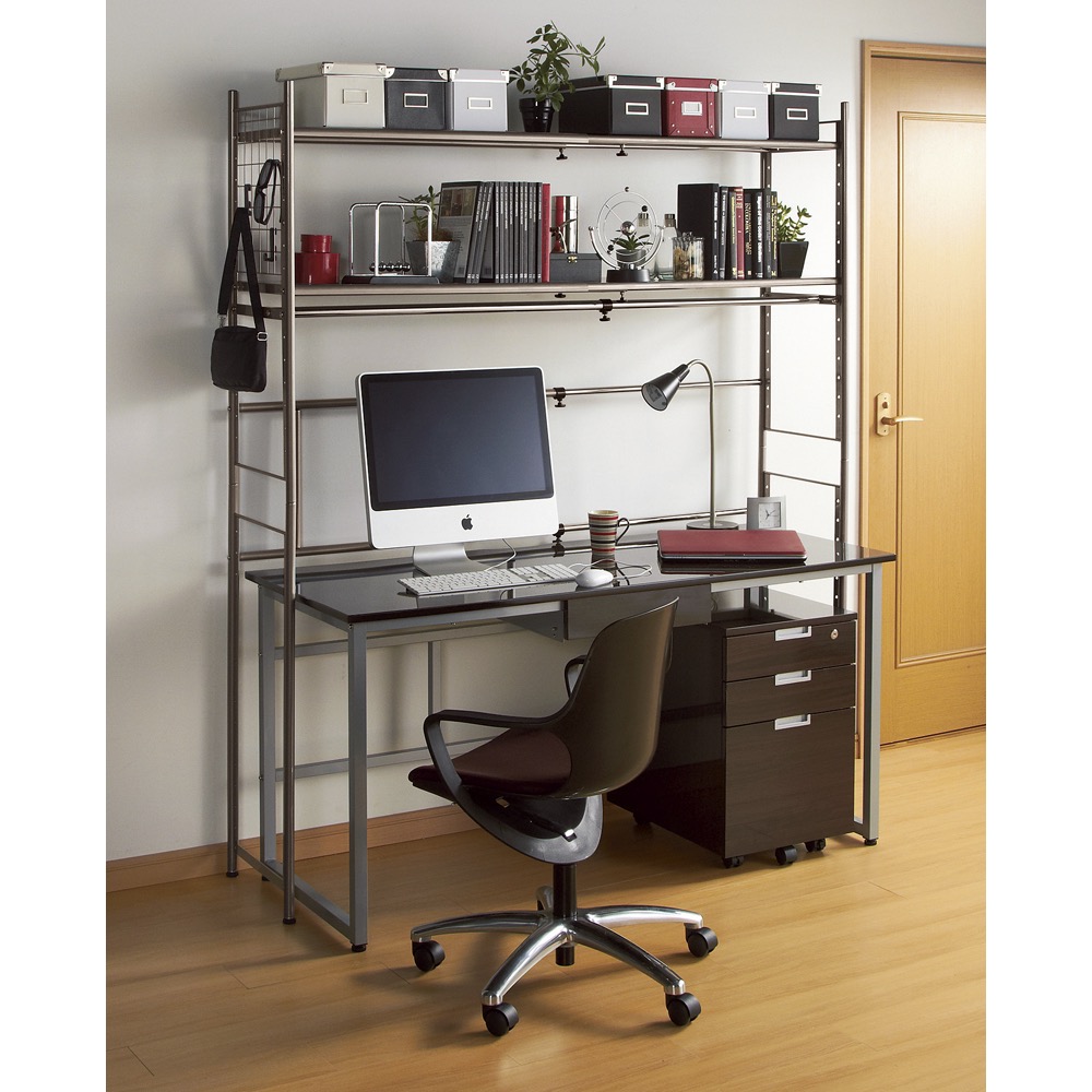 色見本(ア)ダークブラウン デスク上にも 棚の位置は上段でも下段でも設定可能。