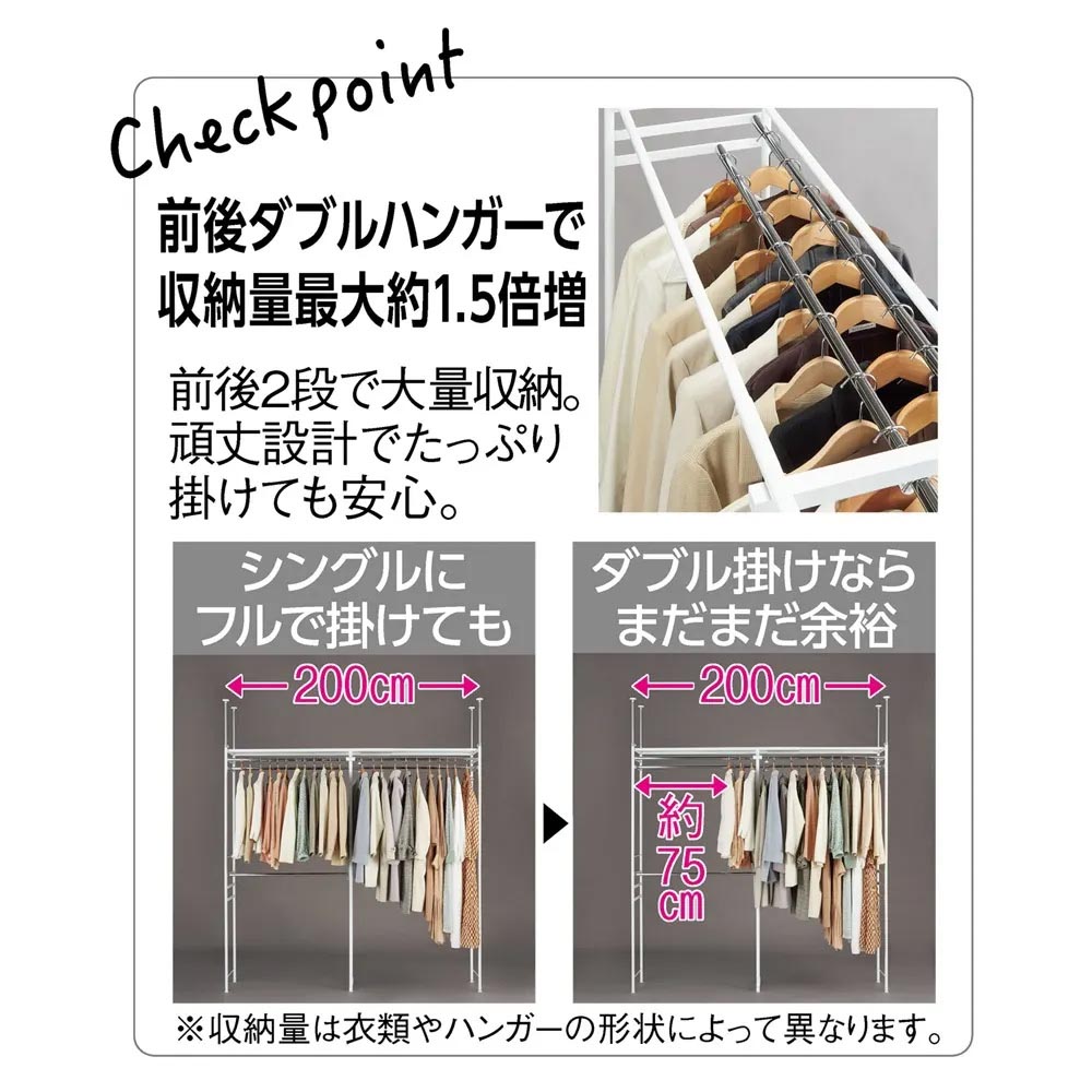 ダブルハンガーで収納量最大約1.5倍増!前後2段で大量収納。頑丈設計でたっぷり掛けても安心。耐荷重は1本あたり約35kg