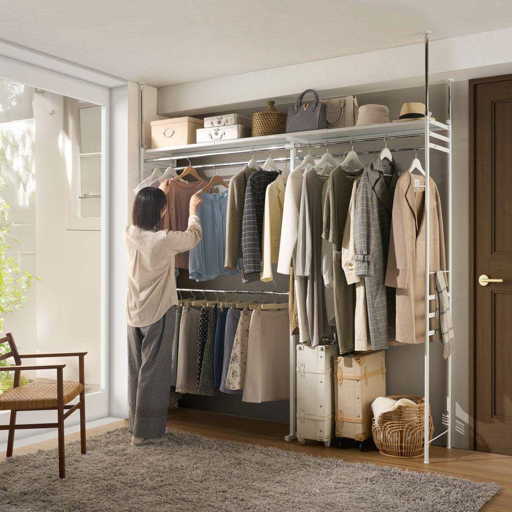 使用イメージ 奥行が浅いため、前後2段の後ろのバーに掛けた服も選びやすく、朝も時短でコーディネートが決まります。 ※写真は別売りのロータイプ幅150cm~250cmタイプです。