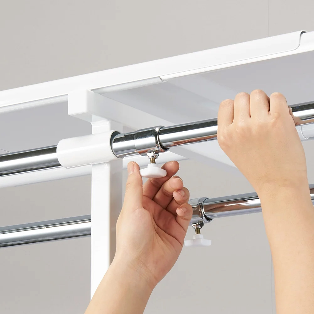 ●幅伸縮はバーの真ん中になる中間リングのツマミを回して簡単に調整できます。お部屋の幅、収納量に合わせて設定ください。