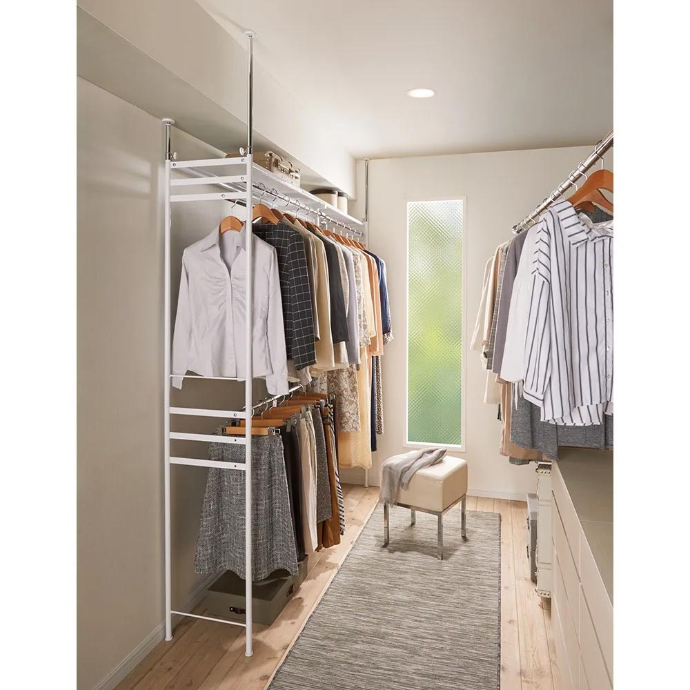 使用イメージ 奥行が浅いため、前後2段の後ろのバーに掛けた服も選びやすく、朝も時短でコーディネートが決まります。 ※写真は別売りのロータイプ幅150cm~250cmタイプです。