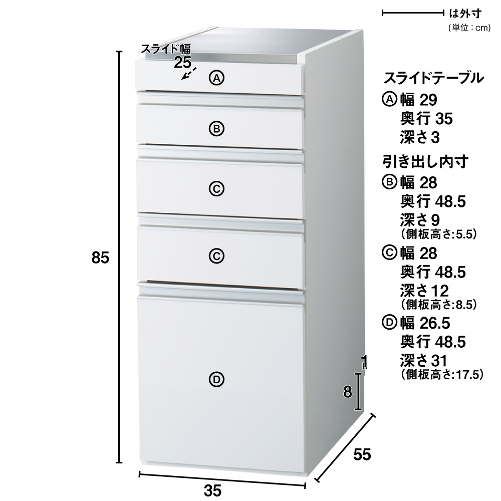 ■引き出し内寸:小(幅28奥行48高さ9cm)、中(幅28奥行48高さ12cm)、大((ストッパー付きスライドレール仕様)幅26.5奥行き48高さ31cm)