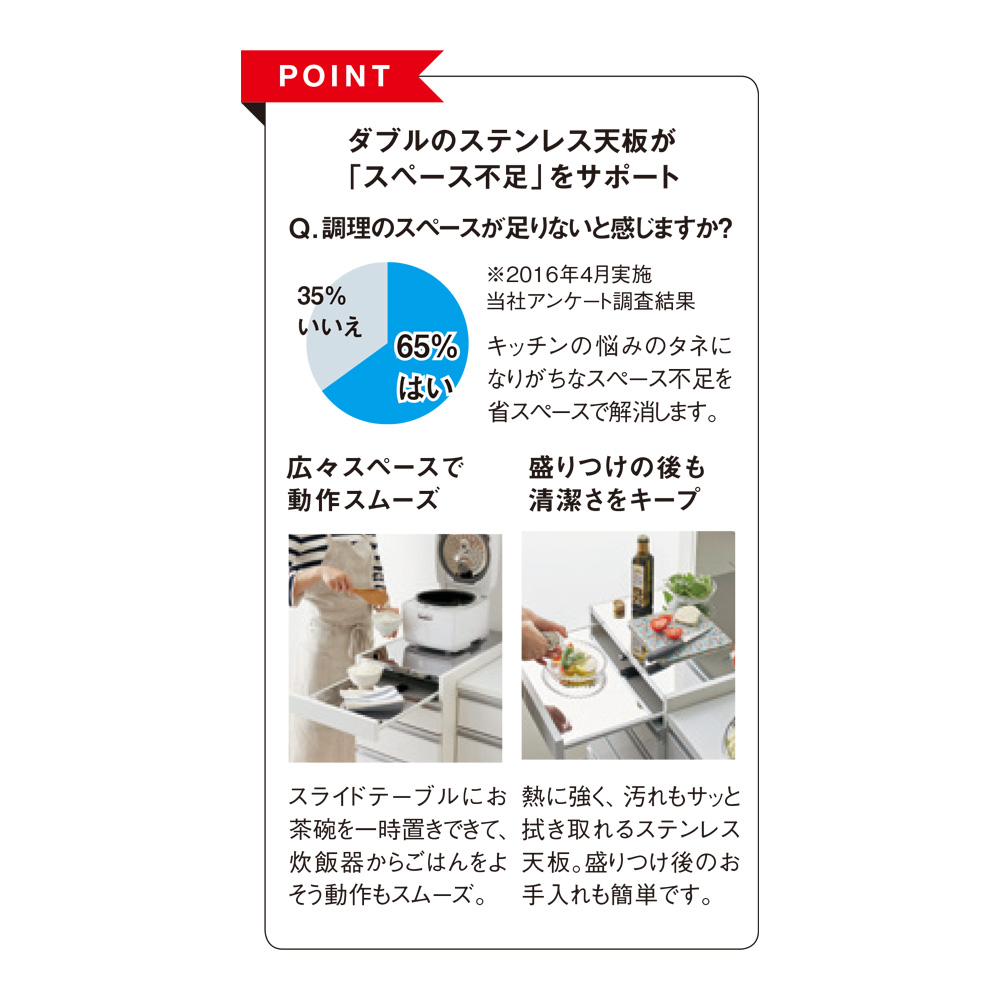 忙しい料理時間をサポートする清潔ステンレス。熱や汚れに強い天板は、調理スペースや食器洗い機置き場としても大活躍。食器の一時置きや盛り付けに便利なスライドテーブルも、こぼれた食材をサッと拭きとれて安心です。
