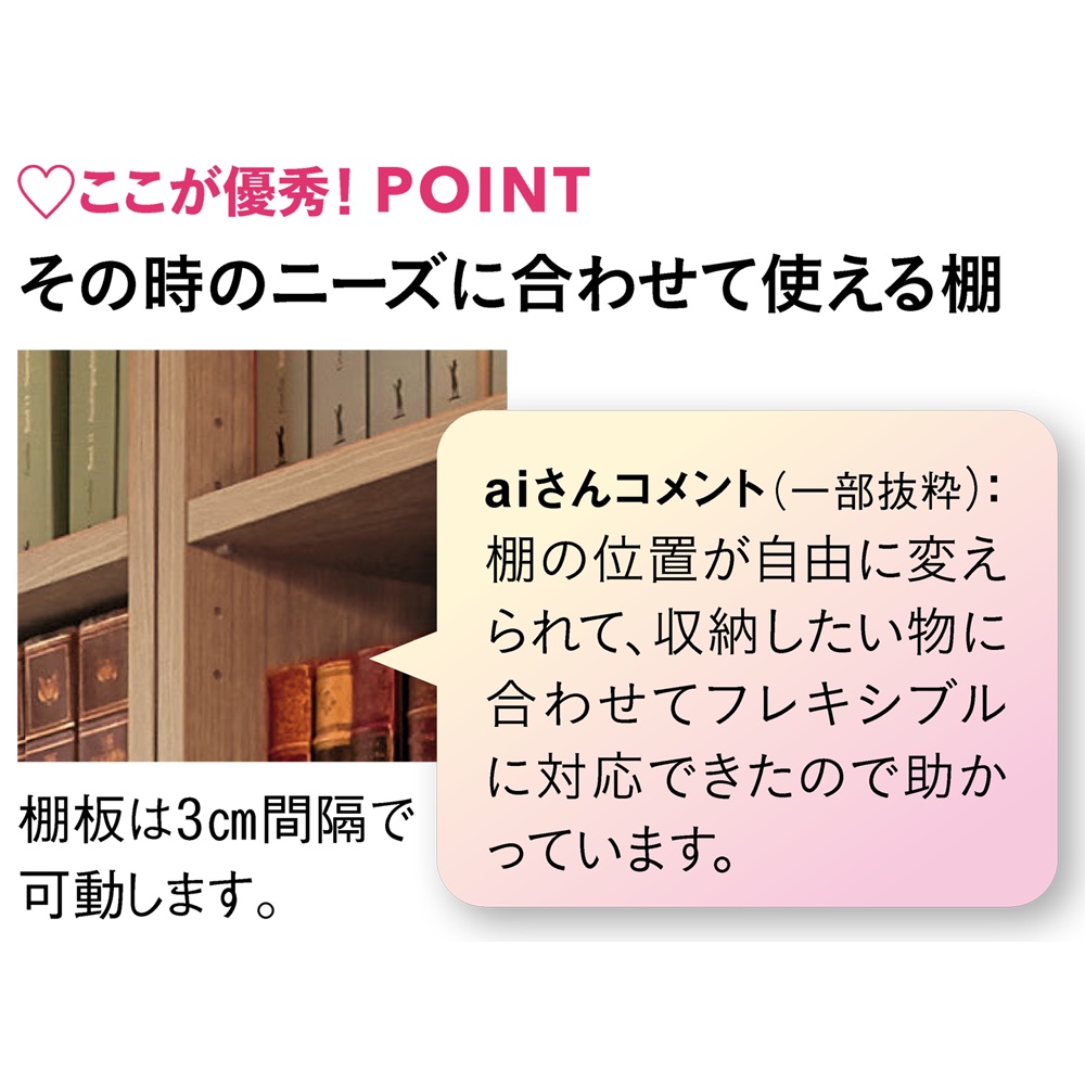 【point2】 棚板は鉄芯入りで「頑丈」に。大量収納ができます。