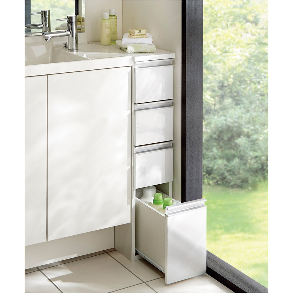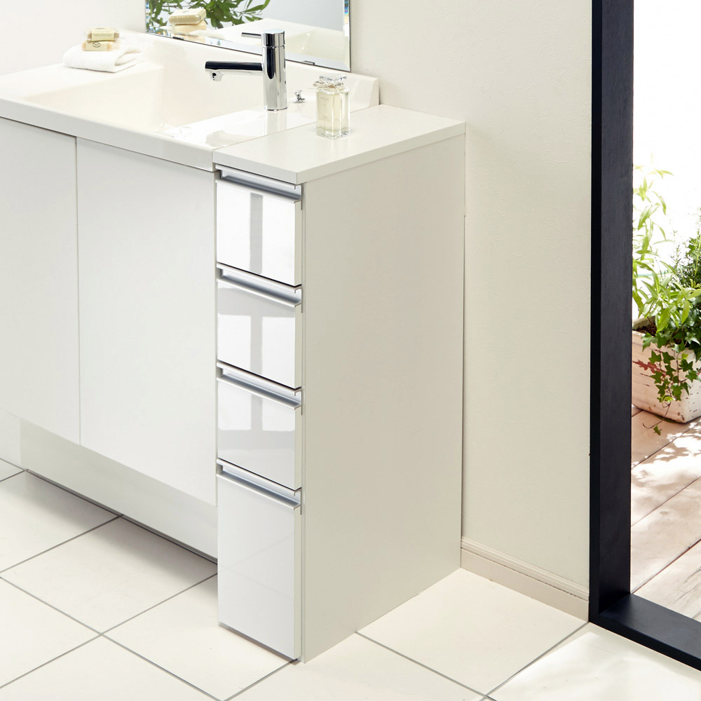 洗面所などの水まわりの隙間を活用できる収納チェスト。前面の光沢感が清潔な洗面空間を演出します。