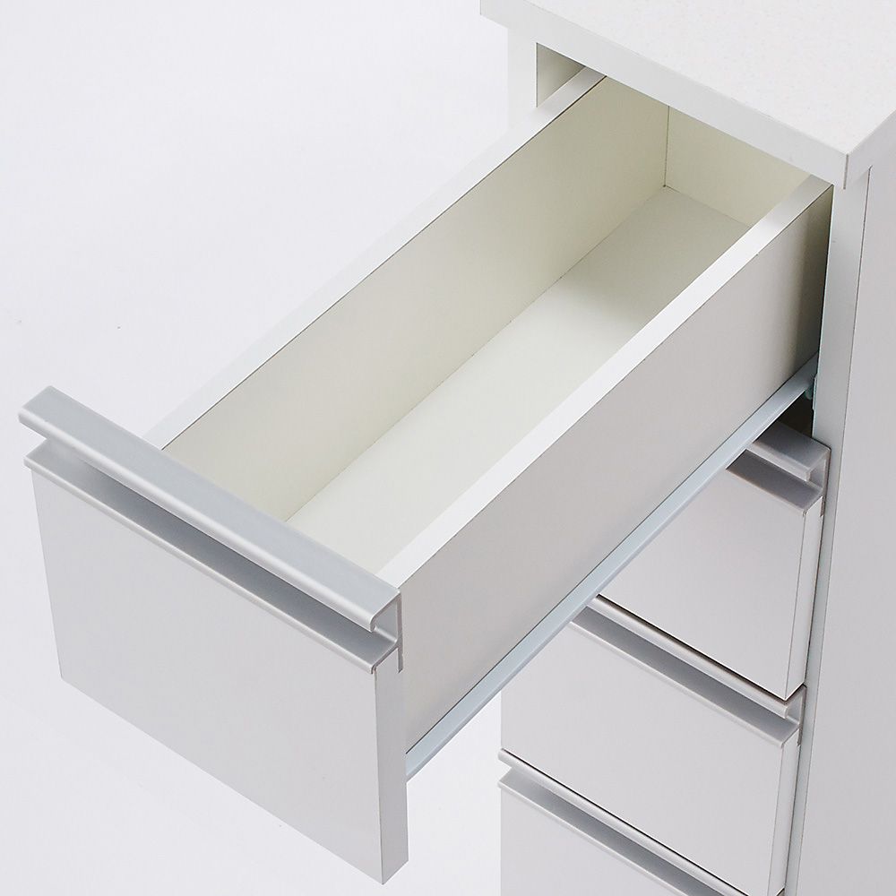 洗面台の横のわずかなスペースを、収納や作業台として活用。洗面所などの水まわりにおすすめの収納チェストです。大理石調の天板と前面の光沢感が、高級感と清潔感のある空間を演出。引き出しは収納物にやさしい内部化粧仕上げと、使いやすさにこだわりました。