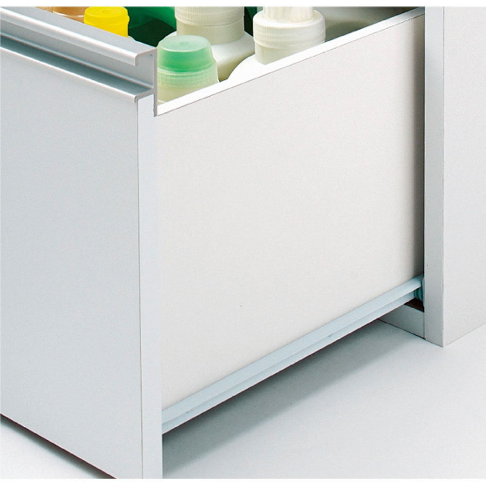 引き出しはすべてレールが付いているので、開閉がスムーズ。奥の物が取り出しやすい嬉しいポイントです。最下段の引き出しは26.5cmの高さがあるので、背の高いボトル洗剤なども収納できます。