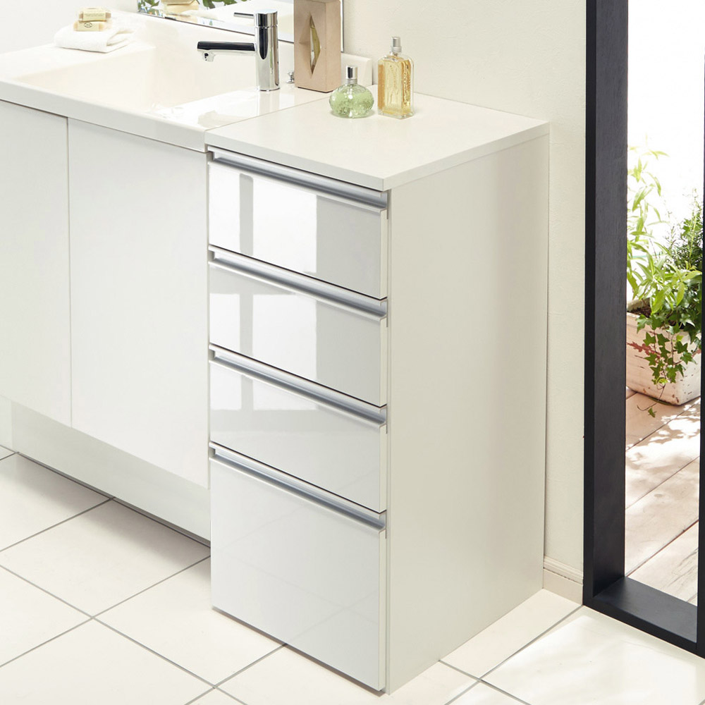 洗面所などの水まわりの隙間を活用できる収納チェスト。前面の光沢感が清潔な洗面空間を演出します。