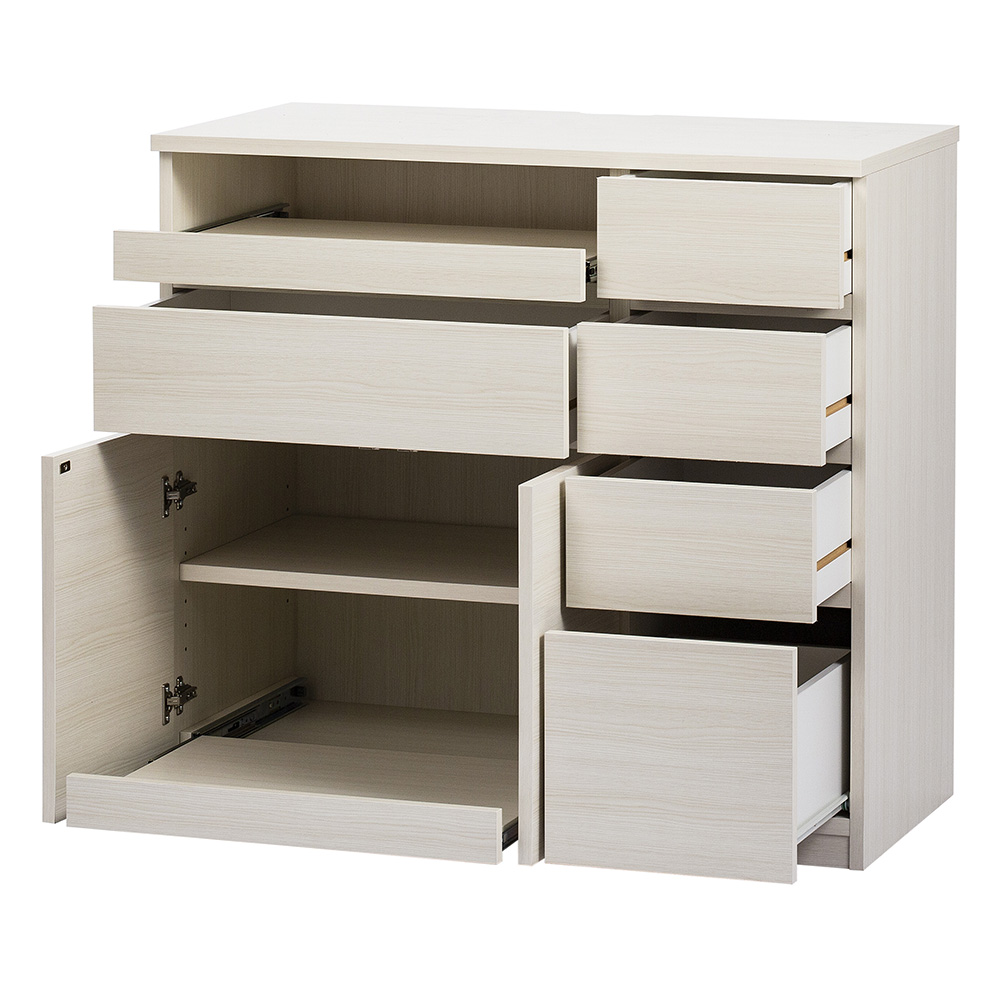 コーディネート例(ウ)ホワイト木目 ※お届けは写真左の「PCキャビネット幅90cm」です。写真右は別売りの「扉チェスト幅90cm」です。