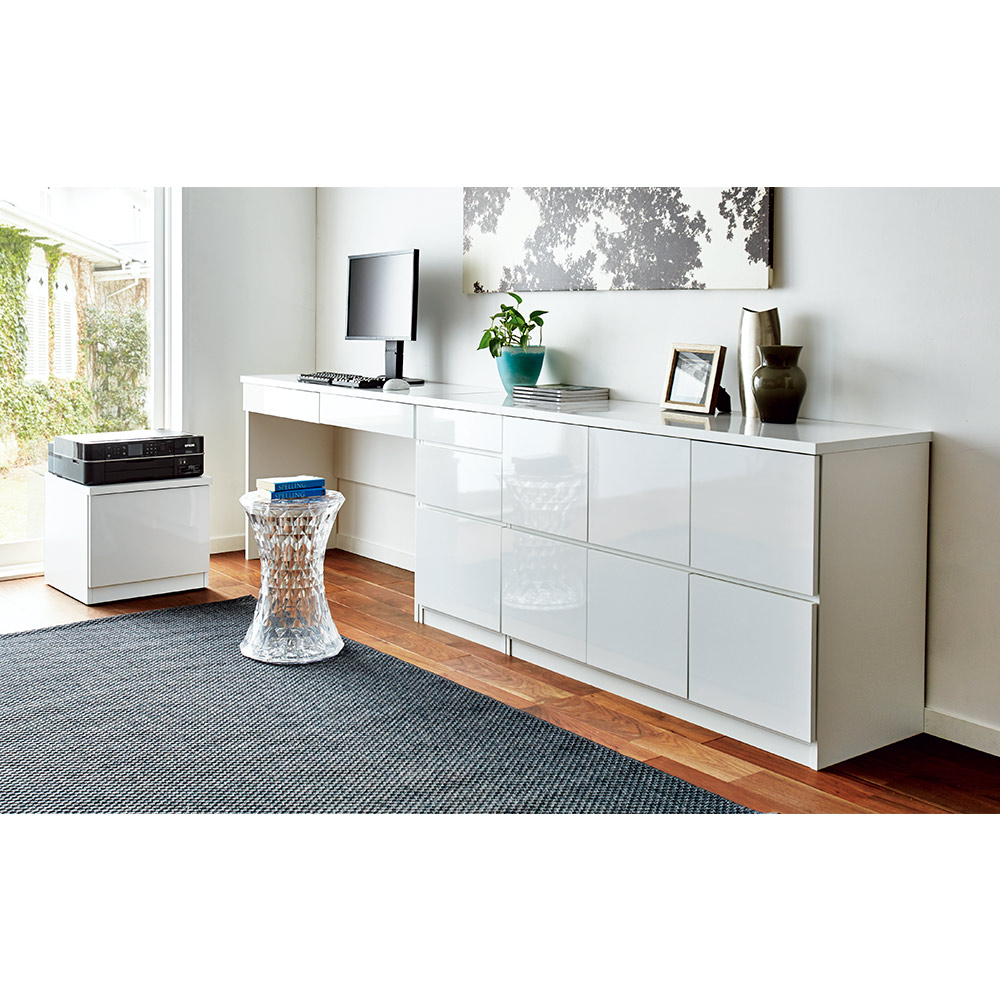 前面の光沢が美しく、スクエアな扉が特徴のスタイリッシュな薄型デスクシリーズ。美しいだけでなく、水・汚れに強いのも特徴です。