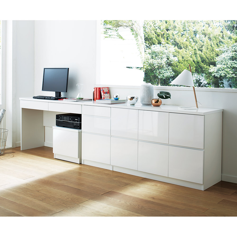 前面の光沢が美しく、スクエアな扉が特徴のスタイリッシュな薄型デスクシリーズ。美しいだけでなく、水・汚れに強いのも特徴です。