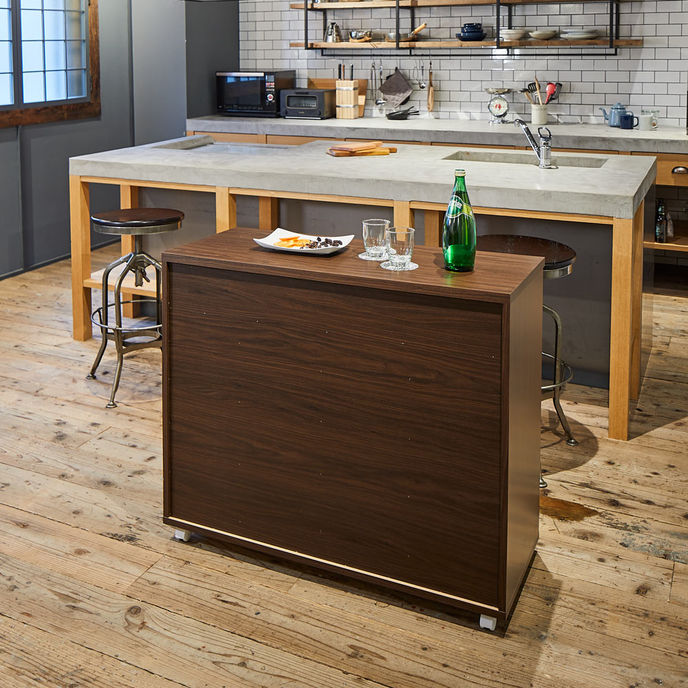 使用イメージ(ア)ダークブラウン キャスター付き(前輪2個ストッパー付き)なので使いたい場所へ動かすのもラク。裏面化粧仕上げ(一部タッカー針が見えます)。 ※写真は4分別 幅99.5cmタイプです。