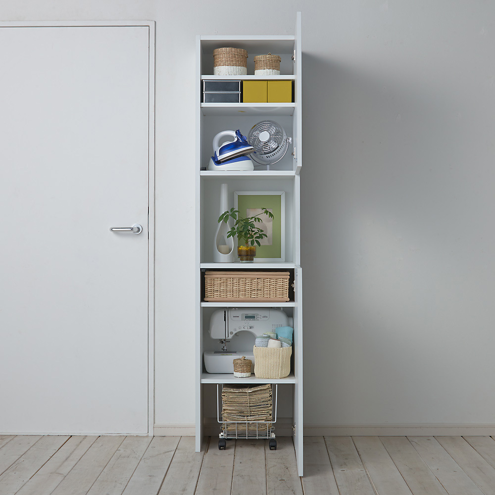 収納物のサイズに合わせて分類して収納できます。可動棚板の高さは3cm間隔で細かく調節できます。(こちらの商品は扉は片側のみです)