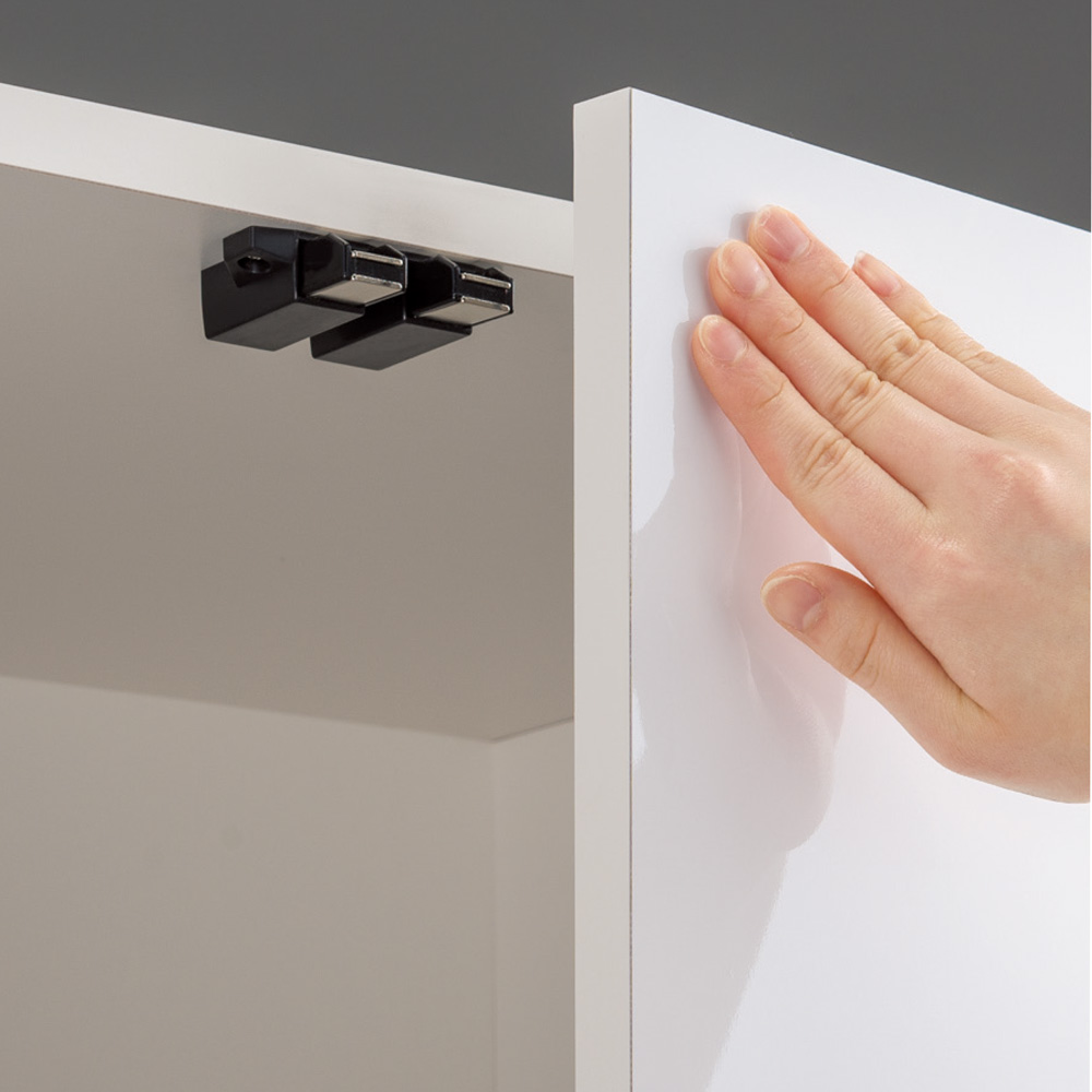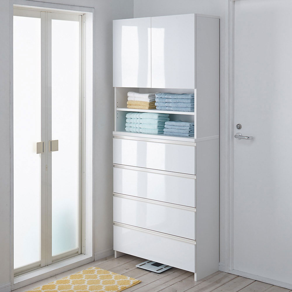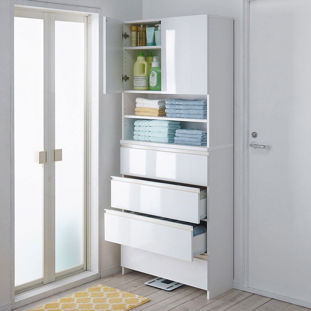 ●前面は水に強い素材なので洗濯機・脱衣所周りでもリネン庫として安心して使えます。●扉はワンタッチで開け閉めができるプッシュ式です。