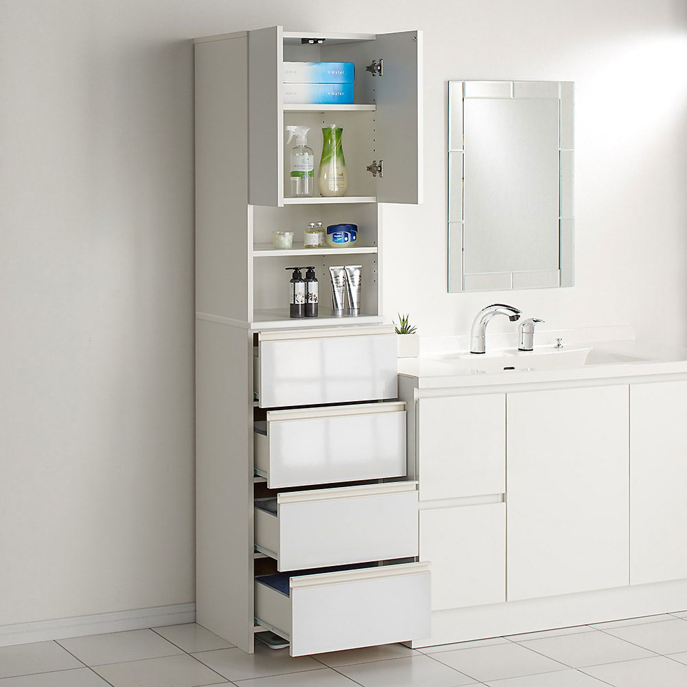 洗面台脇にもぴったり馴染む。扉・引出しを閉じれば清潔感あふれる光沢感が際立ちます。
