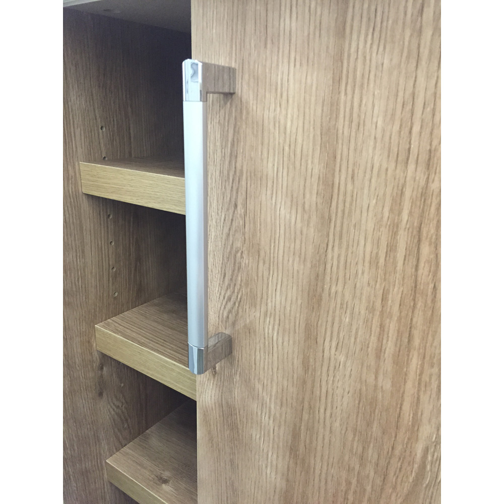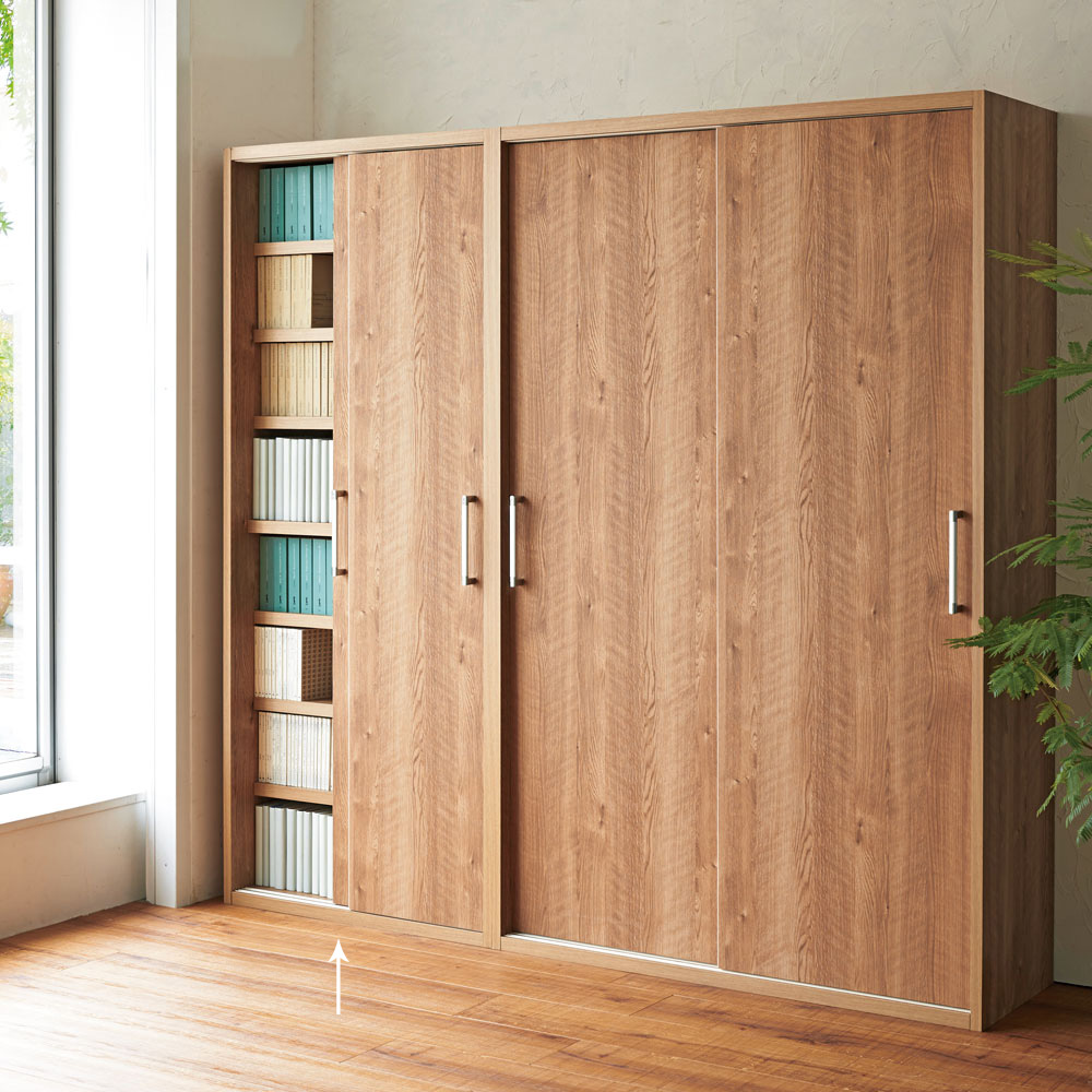 書棚引き戸の裏側に下部に車輪が付いており、引っかかることなく軽い力でスムーズに開閉できます。扉付なので本を日焼けや埃から守ります。
