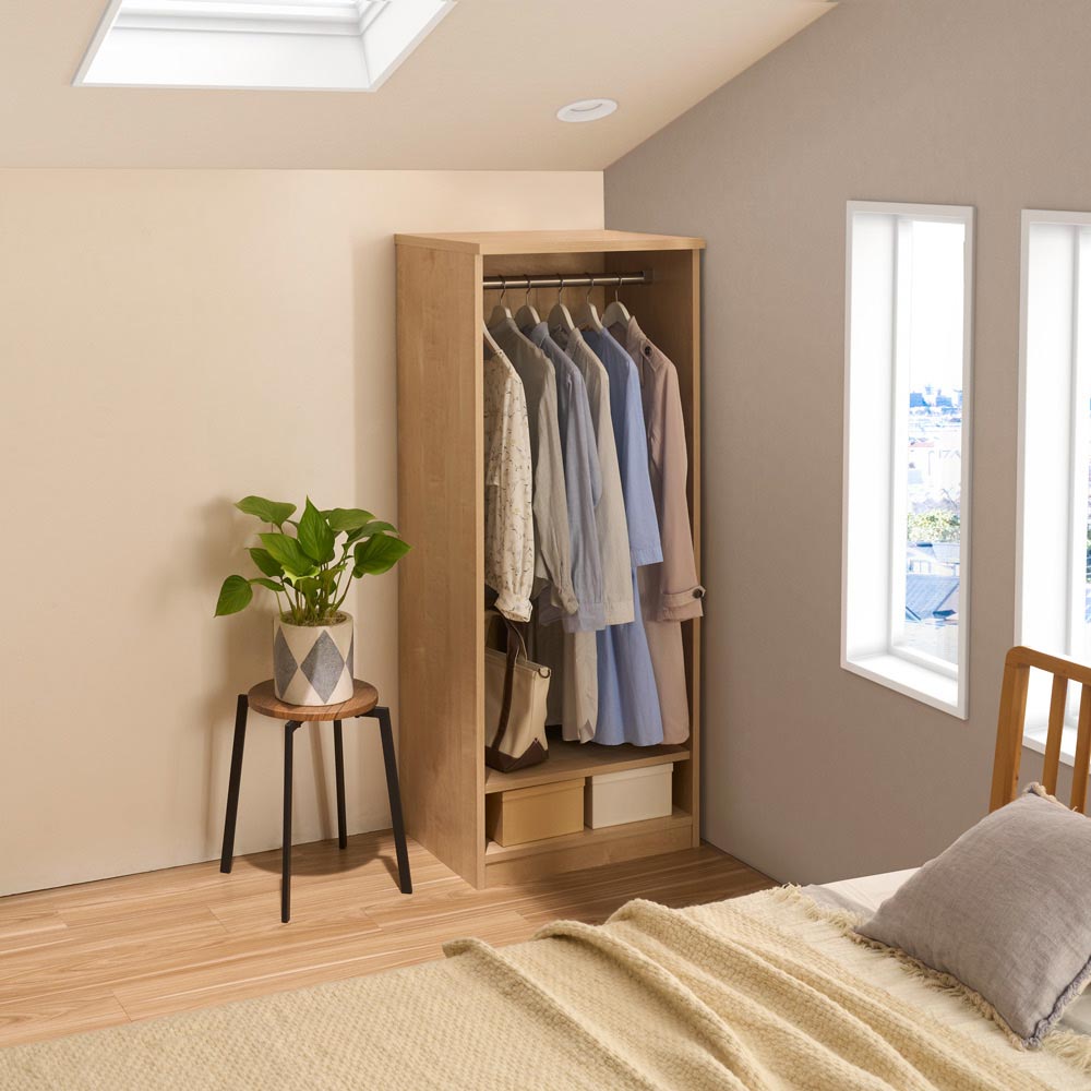 ●斜め天井で天井高の低い空間を衣類収納に利用したい。でも高さが合う家具が見つからない…。●スチールのハンガー収納と同じくらい圧迫感がないワードローブがいい。
