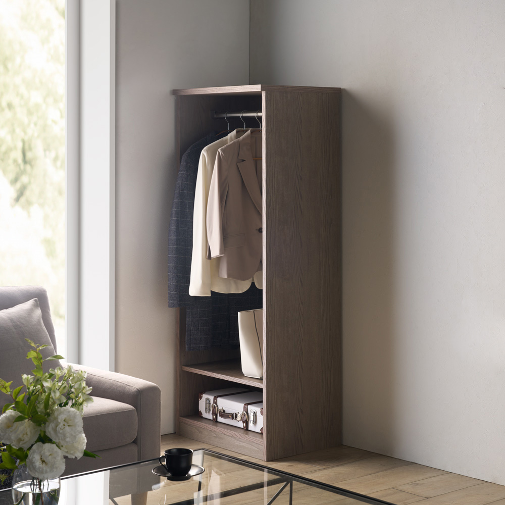 一戸建ての斜め天井やマンションの下がり天井下など、収納家具を置きたくても高さがネックだった空間にも設置できる高さ150 cmのワードローブ。