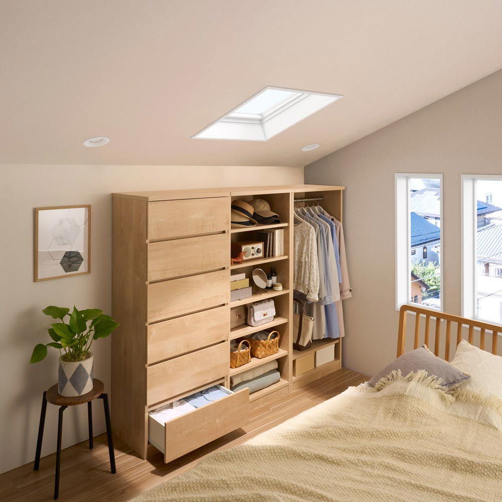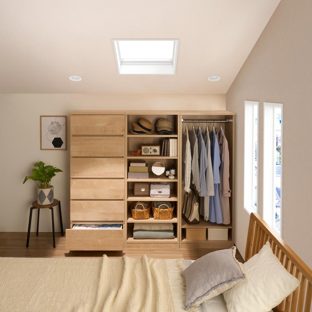 一戸建ての斜め天井やマンションの下がり天井下など、収納家具を置きたくても高さがネックだった空間にも設置できる高さ150 cmのワードローブ。