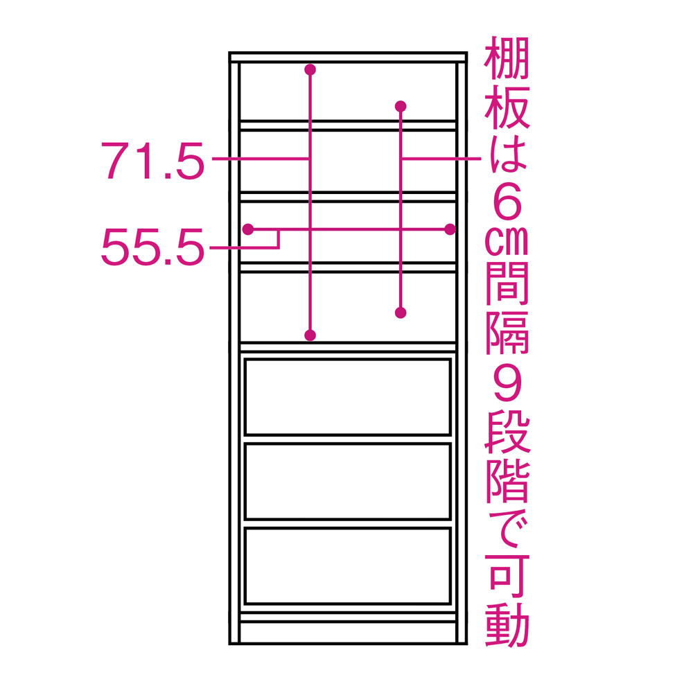 ●棚部:収納したいものの高さに合わせて、棚板の位置を6cm間隔で変えられます。