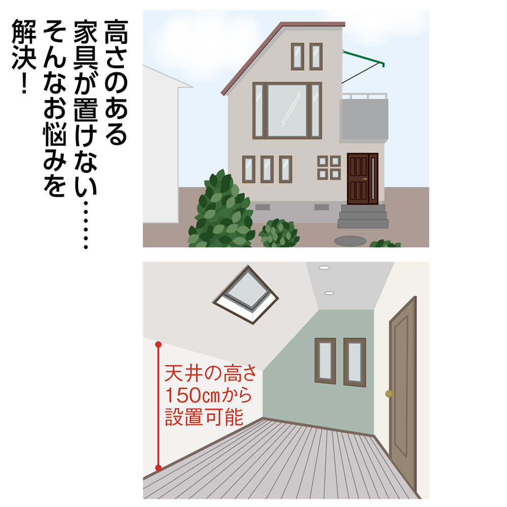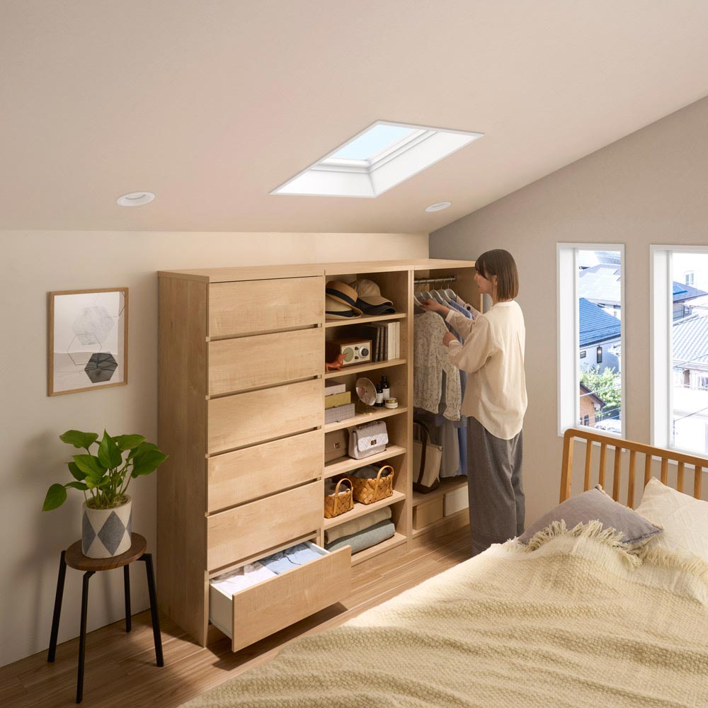 一戸建ての斜め天井やマンションの下がり天井下など、収納家具を置きたくても高さがネックだった空間にも設置できる、高さ150cmのワードローブ。視界に入る天板にも化粧板を使用しているので、お気に入りの小物をディスプレイして楽しめます。こんなお部屋や、こんな方におすすめ!