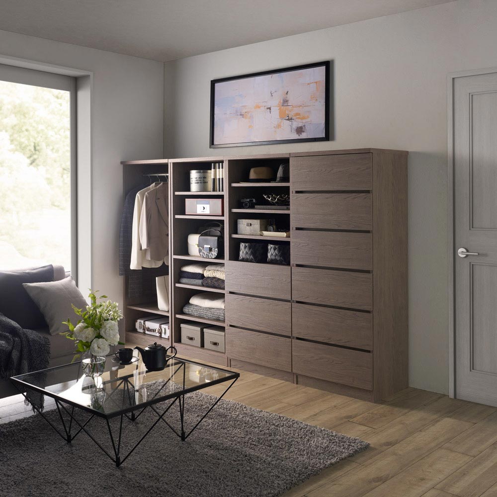 コーディネート例(イ)グレー リビングなど通常の天井高でも圧迫感なく置けます。 ※写真左からハンガータイプ、棚タイプ、棚チェストタイプ、チェストタイプです。