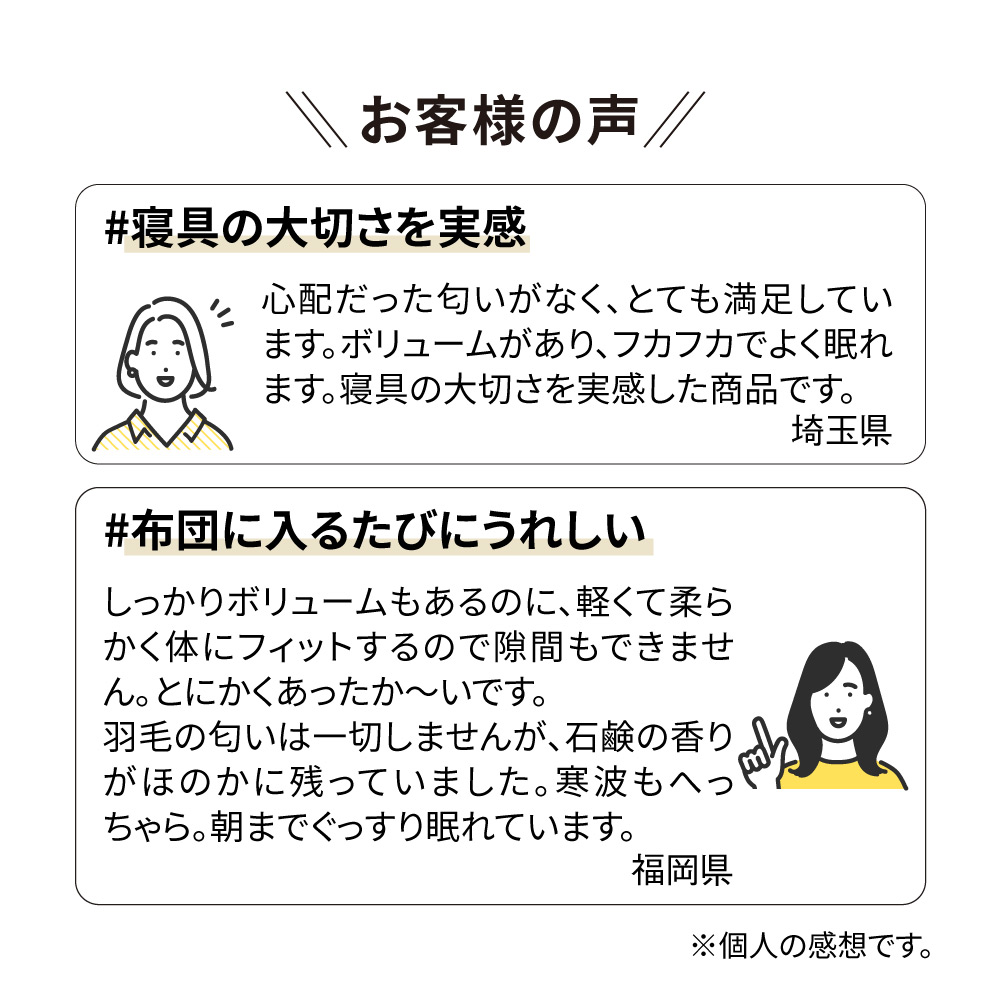 希少な5つ星ラベルのスペイン産「成熟羽毛」羽毛はダウンパワーの数値が大きいほどより多くの空気を含み、保温性も高くなります。本品に使われているスペイン産成熟羽毛は、丈夫でダウンボールが大きく、暖気をたっぷり含むから本当に軽く暖かいのです。トレーサビリティシステムにより羽毛の飼育環境を特定できるのも安心です。
