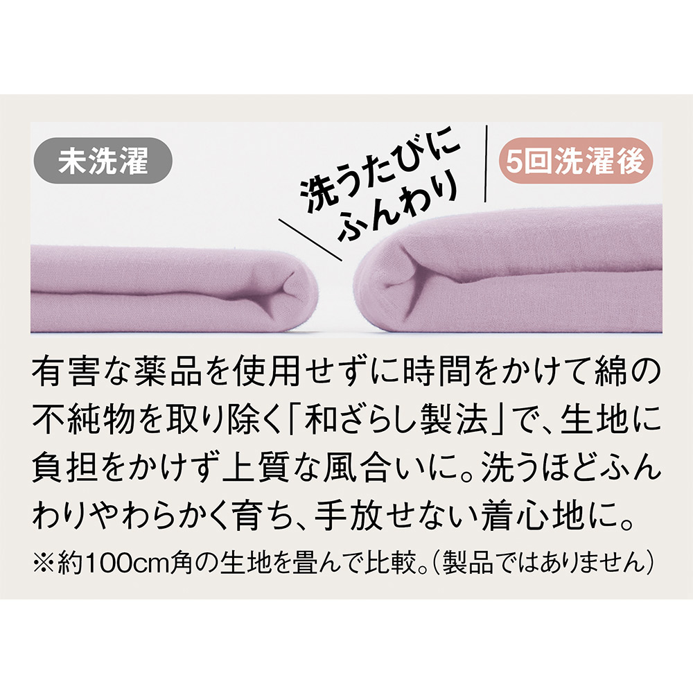 有害な薬品を使用せずにじっくり時間をかけて綿の不純物を取り除く「和ざらし製法」で、さらしの工程に時間をかけることで生地にストレスがかからず綿本来の持つソフトな風合いが保たれます。また、洗えば洗うほどふんわりやわらかく育ち、手放せない着心地に。【オールシーズン使えます】