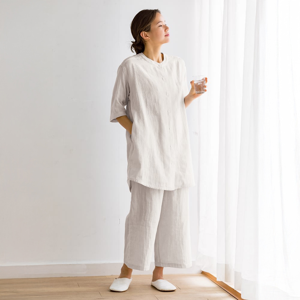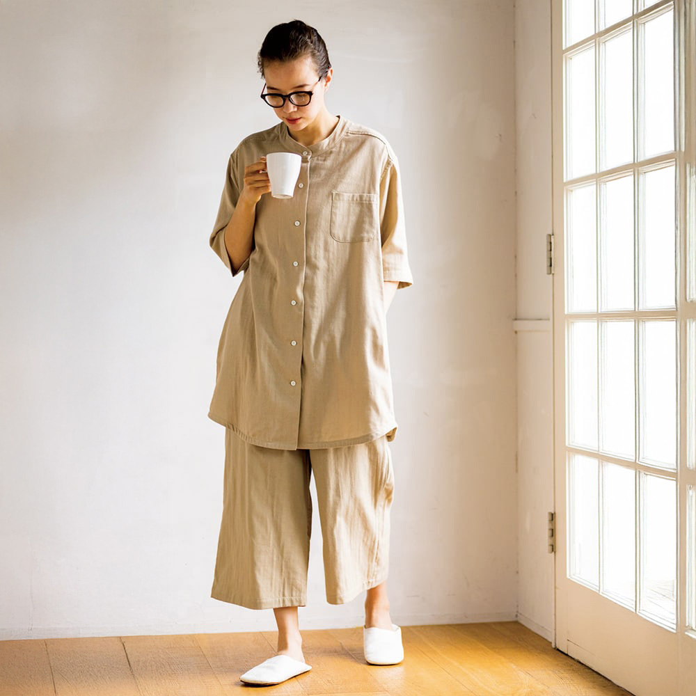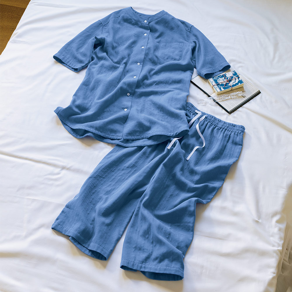 綿100%の和ざらし二重ガーゼで仕立てたパジャマはふんわり肌にやさしく、汗を素早く吸収。袖は肘下、パンツは膝下までカバーする丈なので、軽やかでありながら冷えは防いでくれます。リラクシーでこなれ感のあるデザインも魅力。やみつきになる着心地にリピーターも多数です。(ア)インディゴブルー