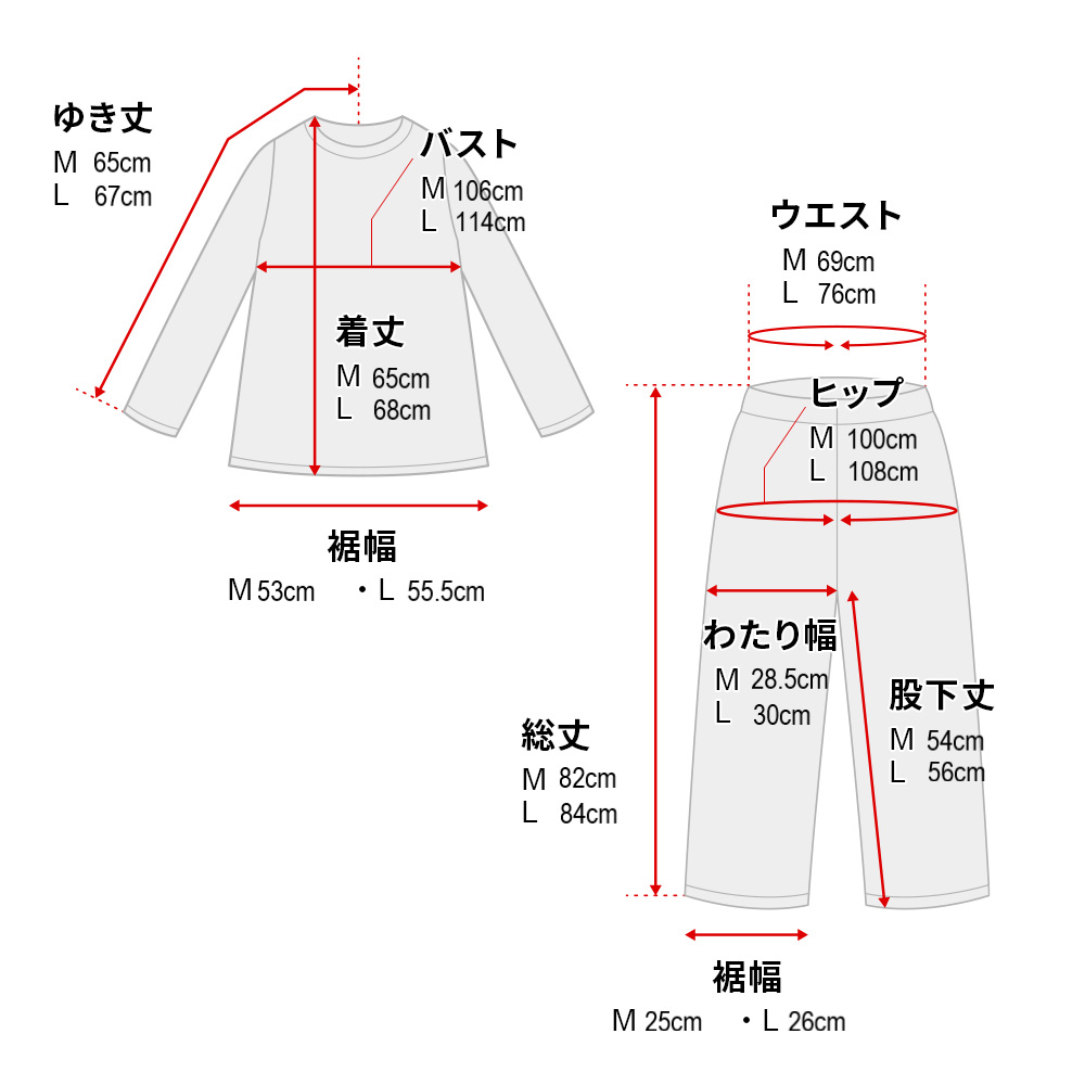 【パンツ】ウエスト(適応)…(69~77cm)・ヒップ(適応)…(92~100cm)・総丈…84cm・股丈…56cm