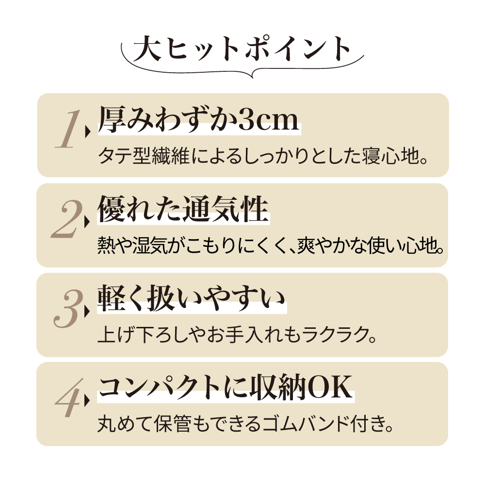 (イ)グレー(立体メッシュ)(写真はシングル) 厚さ約3cm!薄くて軽くて心地いい敷布団。この薄さでもフローリングに1枚で快適。上げ下ろしがラクで収納もかさばりません。
