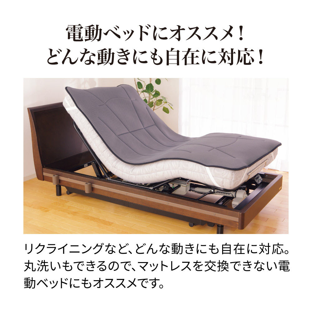 敷き布団やマットレスに重ねてお使いいただけることはもちろん、リクライニングなどの動きにも自在に対応し、丸洗いもできるので、マットレスを交換できない電動ベッドにもオススメです。※介護用電動ベッドにお使いになる場合は、取扱説明書等をよくご確認の上ご使用ください。商品画像の説明