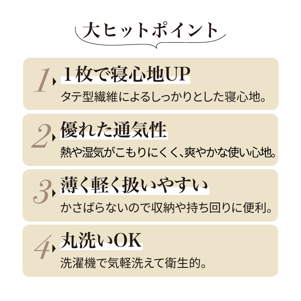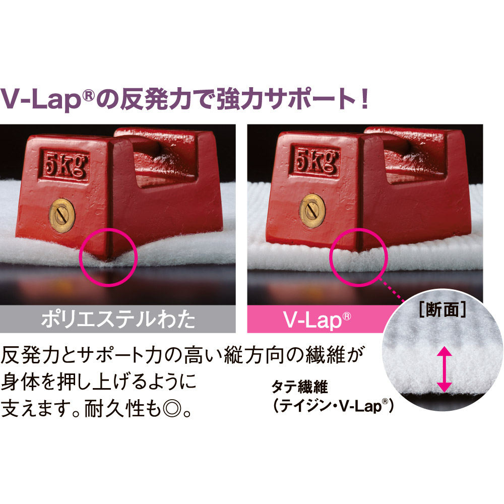 テイジンの高機能クッション素材V-Lap(R)を中素材に使用。特殊なタテ構造の繊維が優れた反発力を発揮します。ヘタりにくさも◎。腰を支えられなくなったマットレスや、ふかふか感を失った敷布団も、この敷きマット1枚をサッと重ねて4隅ゴムで留めるだけで寝心地UP!!