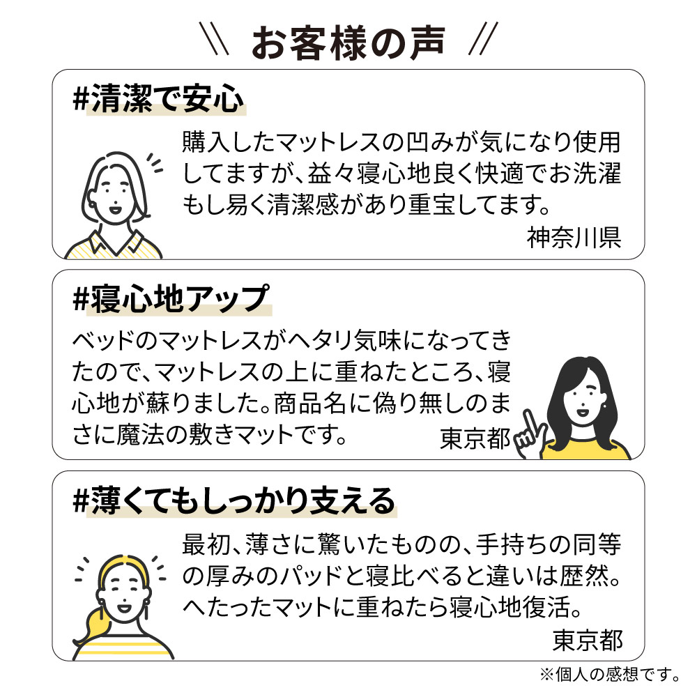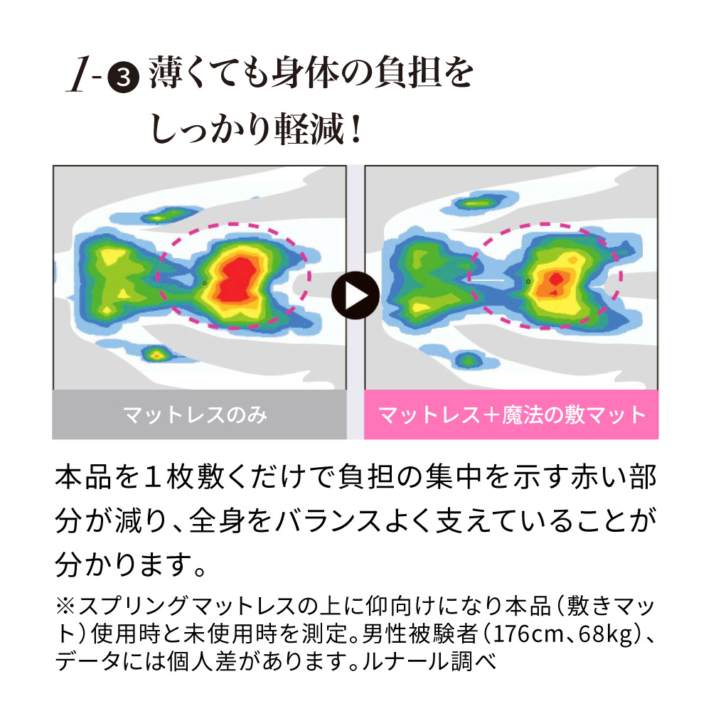 薄くて軽いのに、驚くほどしっかりとした寝心地。お使いのマットレスや敷き布団の寝心地を魔法のようにアップしてくれる敷きマットです。くるりと丸めて収納にも場所を取りません。