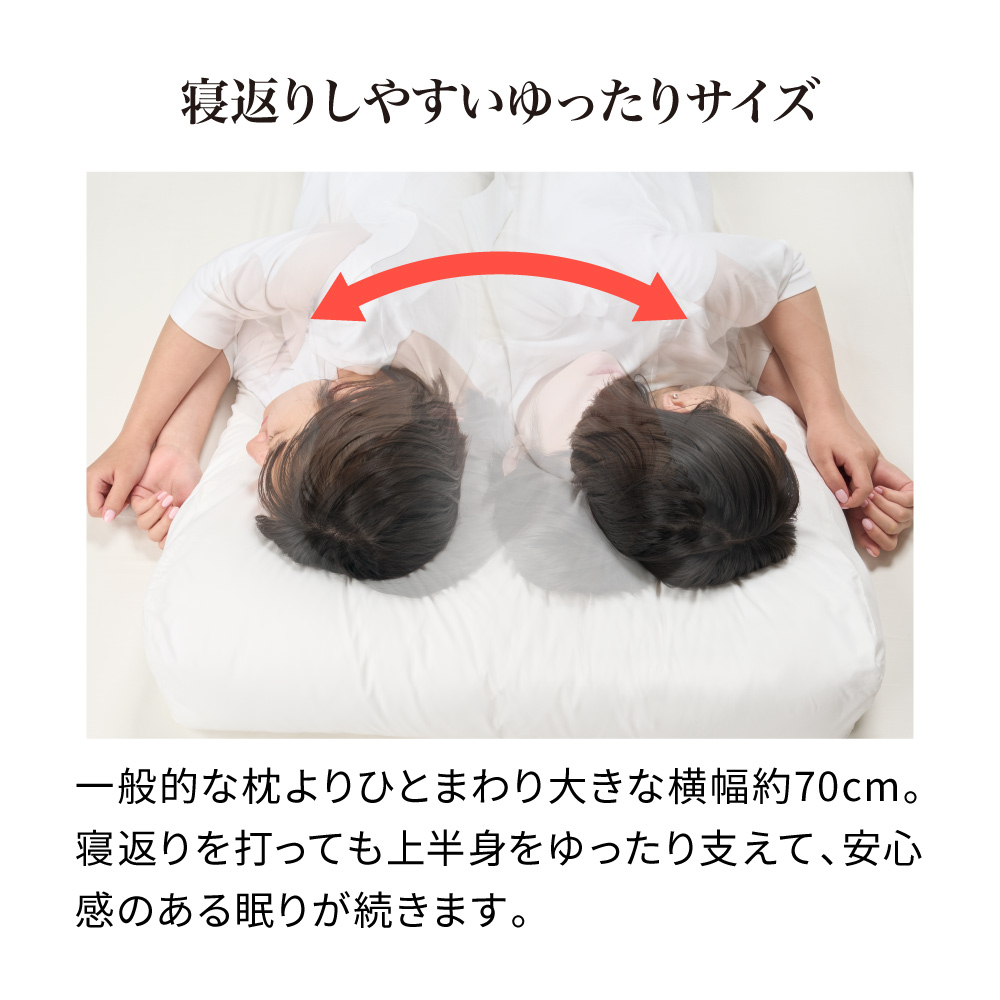 一般的な枕よりひとまわり大きい横幅約70cm。だから、寝返りを打っても肩まわりまでしっかり包み込み、上半身をゆったり支えてくれます。大きさゆえの安心感が、心地よい眠りへとつながります。