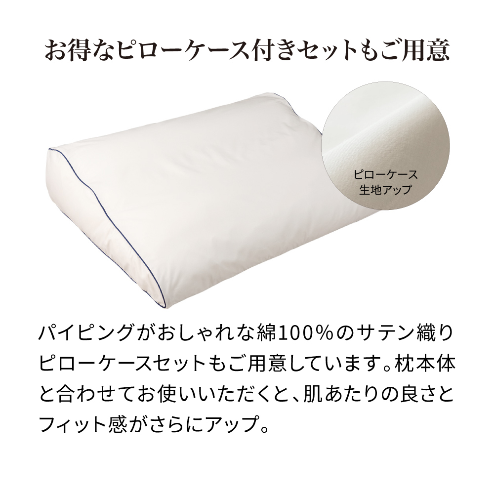 パイピングがおしゃれな綿100%のサテン織りピローケースセットもご用意しています。枕本体と合わせてお使いいただくと、肌あたりの良さとフィット感がさらにアップ。商品画像の説明