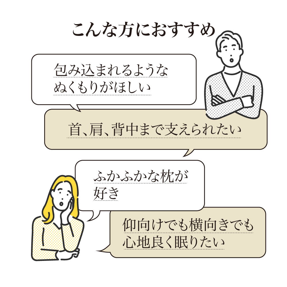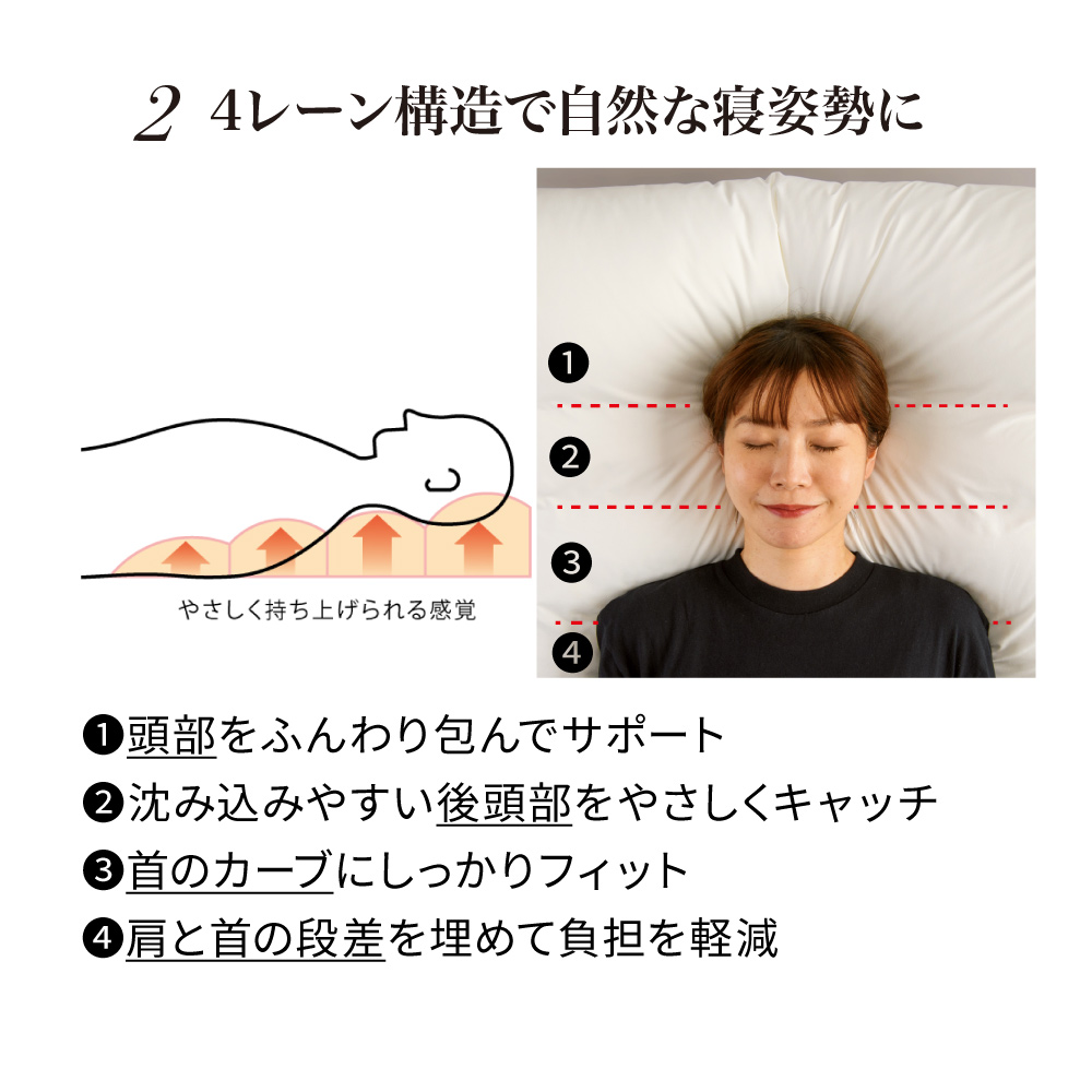 頭、首だけを支えるのでは無く、上半身へのサポート力は残しつつ優しく包み込んでくれる枕を企画しお客様に体感していただきたい!という想いを持って企画した商品になります。実際に寝てみるとふかふかな感触の中に適度な反発力があるので、不思議と浮遊しているかのような心地よさです。寝返りしても寄り添う、身体の一部のような商品です。