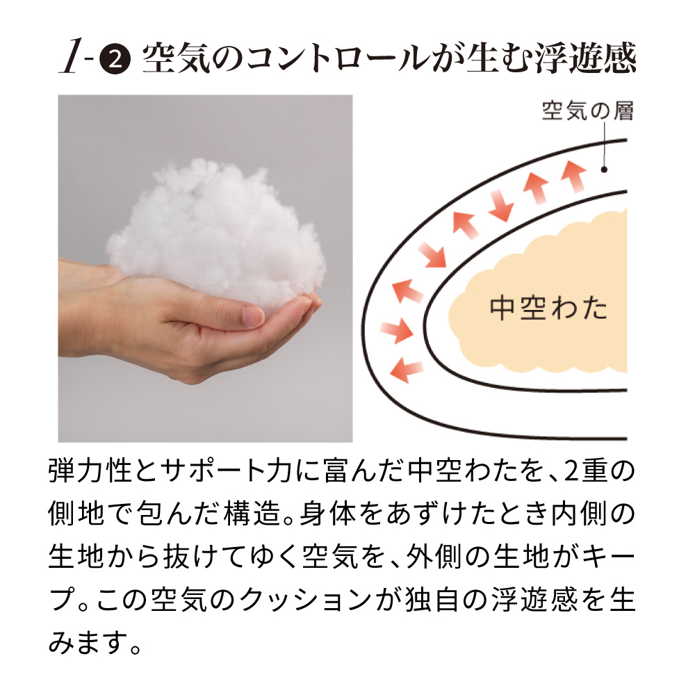 弾力性とサポート力に富んだ中空わたを、2重の側地で包んだ構造。身体をあずけたとき内側の生地から抜けてゆく空気を、外側の生地がキープ。この空気のクッションが独自の浮遊感を生みます。