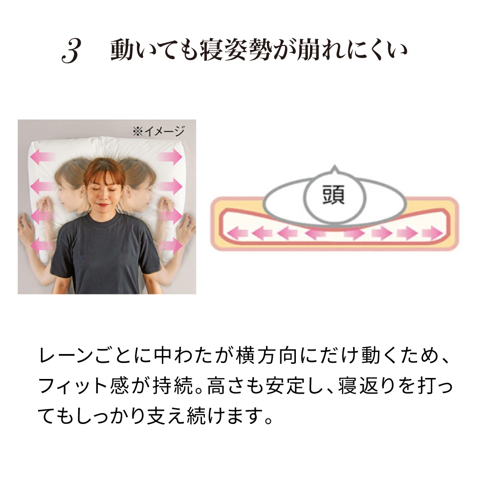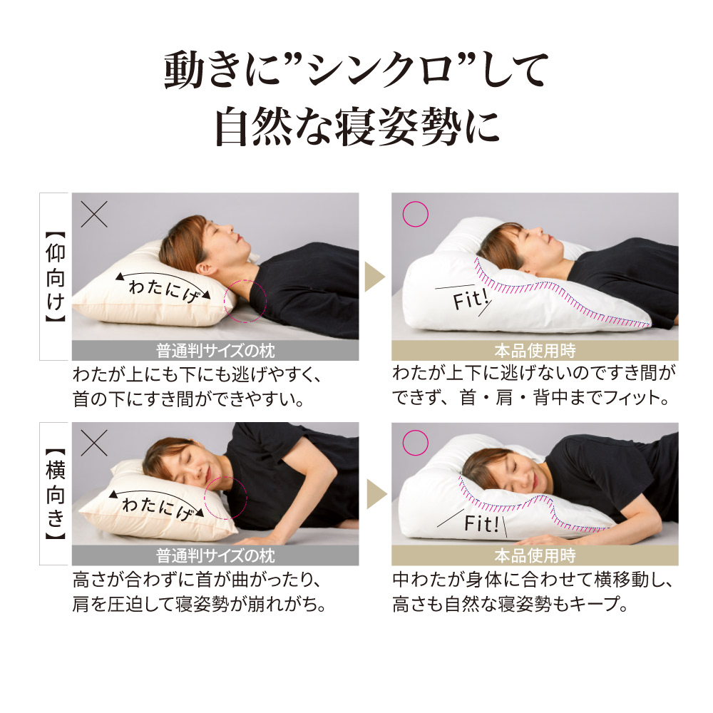 首が曲がったり肩を圧迫したりと、寝姿勢が崩れがち。シンクロ枕は中わたが身体に合わせて横移動するので、心地よい高さになって寝姿勢もキープします。