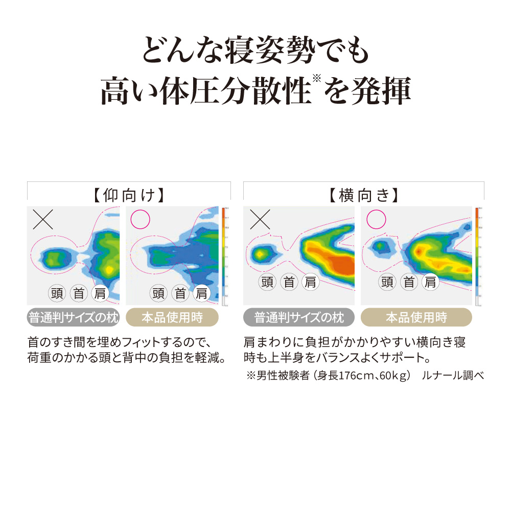 仰向け時、首のすき間を埋めてフィットするので、荷重のかかる頭と背中の負担を軽減。肩に負担がかかりやすい横向き寝時もバランスよくサポートします。 ※男性被験者(身長176cm 、体重60kg)ルナール調ぺ ※データには個人差があります。