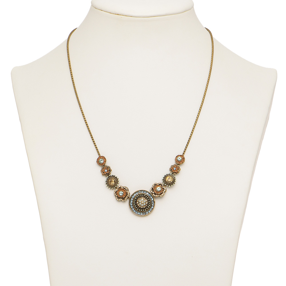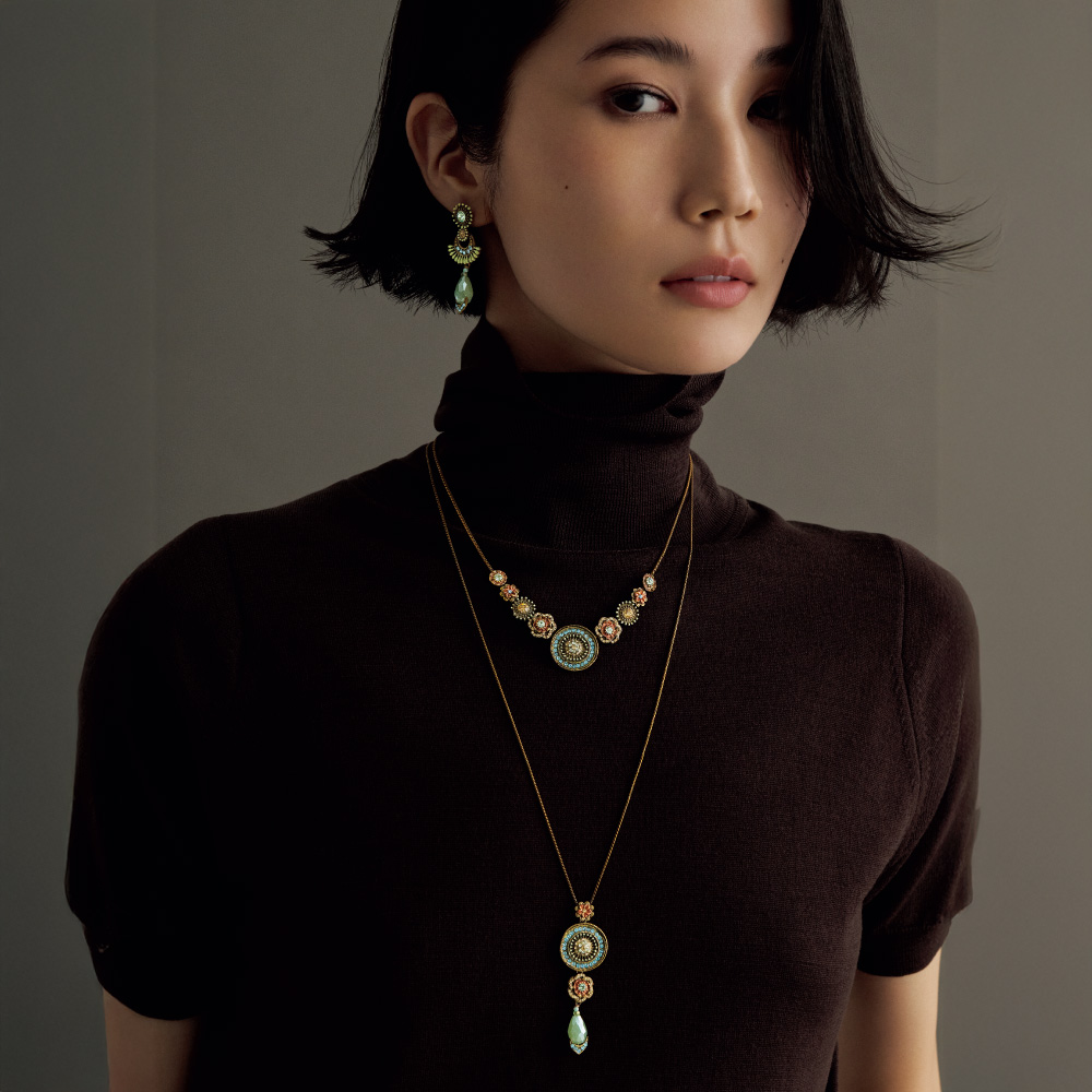 ラウンド形モチーフを中央に、一つずつが凝った作りのフラワーモチーフを並べました。大人っぽいニュアンスカラーも比類ない美しさ。商品画像の説明。